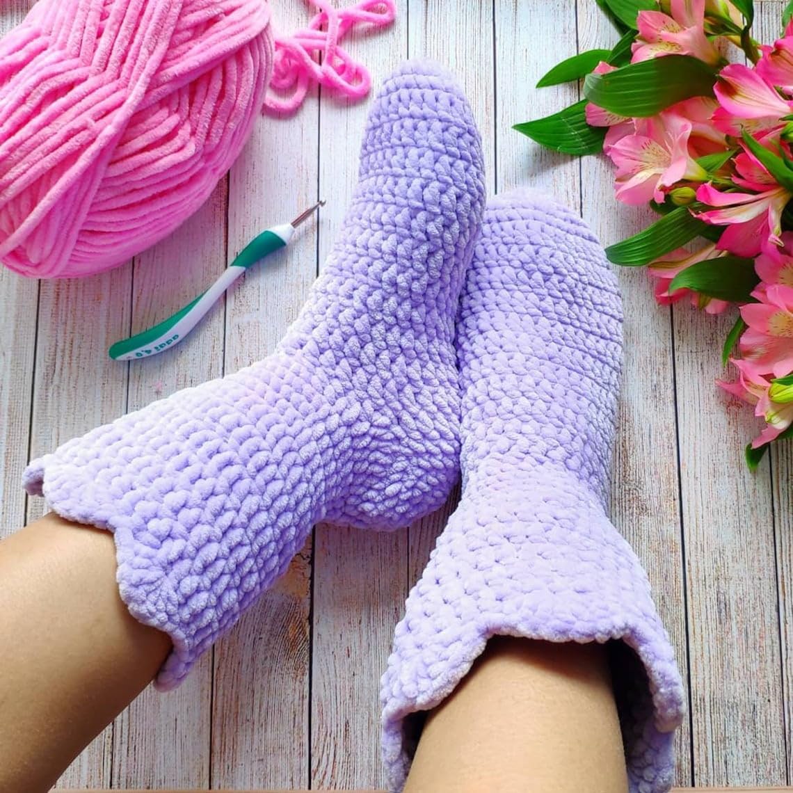 Suitable for knitting with a 6.5 mm (US 10.5) needle size or crocheting with a 4.5 mm (US 7) hook.