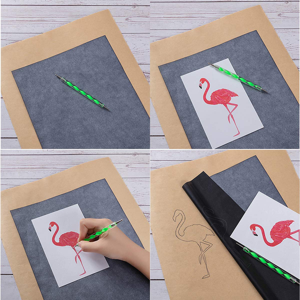 Package Includes: Contains 50 sheets of 11.7″ x 8.3″ white carbon papers and 100 sheet black carbon papers;5 pieces 5.2 inches long double ended tracing stylus dotting tools, the top ball diameter ranges of stylus from 1 to 3 mm.