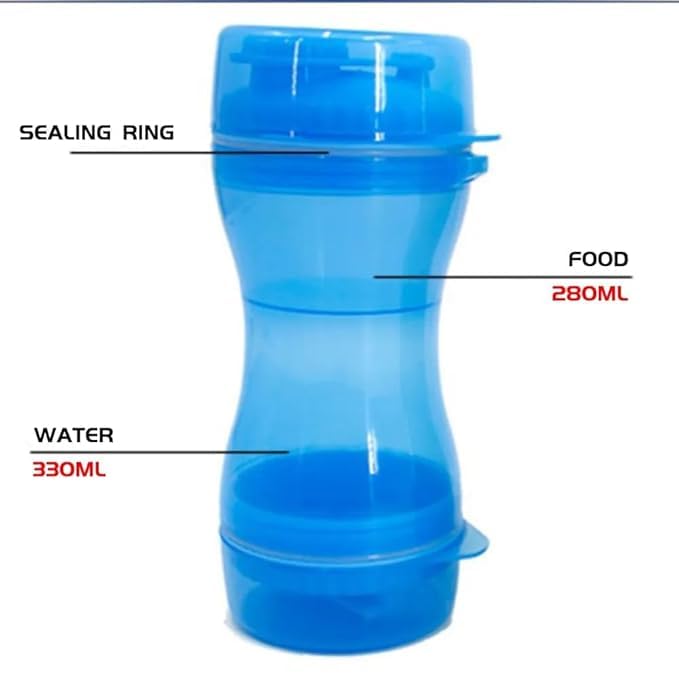 Traveling pet food container with collapsible dog bowls is good for outdoor walking hiking and travelling. A portable water and food container, this 2-in-1 bottle has collapsible bowls and plenty of space for hydrating your hair buddy. two bowls — one for water and one for food — this bottle is perfect for long car rides and hikes. The container even has two chambers and two mouths with lips on the cap to allow you to carry and pour both food and water without them mixing. Compact and Convenient Eliminates the need for separate bowl or bottle, making it a single, lightweight solution for hydration, feeding, and storage of small items like keys or earbuds. Two layers’ design enables to hold water and food in the meantime during outdoor walking. Every separate part makes it easy to clean and wash after usage. Robust and Leak-Proof Bottle This dog water bottle with feeding bowl is leak-proof, preserving your peace of mind on the move. Ideal for a trip to the store, car, hikes, camping, or daily walks, it’s built to last. Perfect bottle body size enables comfortable hand grisp, easier to feed your pets. 2-in-1 Versatile Companion Our dog travel water bottle with bowls attached is not just for hydration, this innovative bottle doubles as a feeding solution with 2 detachable bowls, perfect for keeping both you and your pet hydrated and fed during any outdoor adventure. Hanging a rope on the top makes it easy to carry or put in bag, perfect for outdoor use.