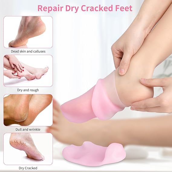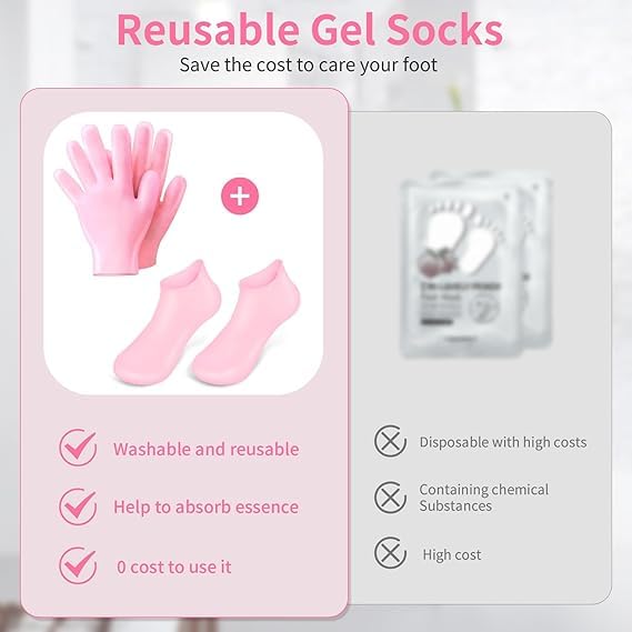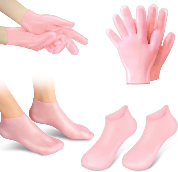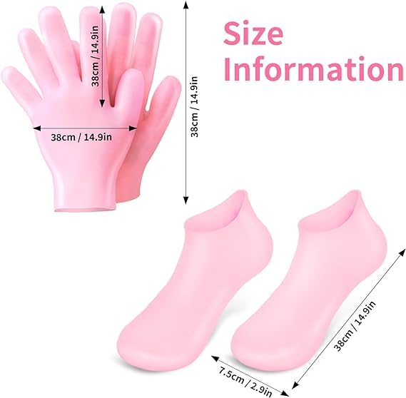 description :-2 Pairs Silicone Moisturizing Socks Gloves for Dry Cracked Feet Hand Women, Soft Gel Pedicure Foot Spa Aloe Socks, Anti-Slip Moisturizerl Socks for Dry Cracked Feet Overnight Foot Hand Care Easy to Clean and Reusable: Keep your foot care routine hassle-free. Our moisturizing gel socks are easy to clean and can be reused, making them a sustainable choice. With just 25 minutes of use 2-3 times a week, you can enjoy the best results without the need for expensive salon treatments.Non-Slip Design for Safety: Move with confidence! The bottoms of silicone foot socks are equipped with anti-slip dots, providing secure traction. Whether you’re at home or on the go, you can wear them worry-free, preventing slips and falls during use. Package Included: 1 Pair of silicone feet socks and 1 pair of silione gloves. Washable and unisex, can be washed repeatedly, longer use time. Note: Anti-sticking powder is included inside the socks and gloves. It’s not dust. Please feel free to use it.