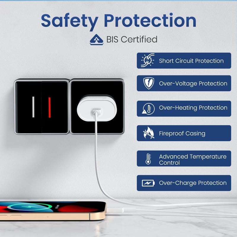 Compact Design with premium hard ABS Plastic body for extra durability and sturdiness ,BIS certified to provide safe and reliable charging.