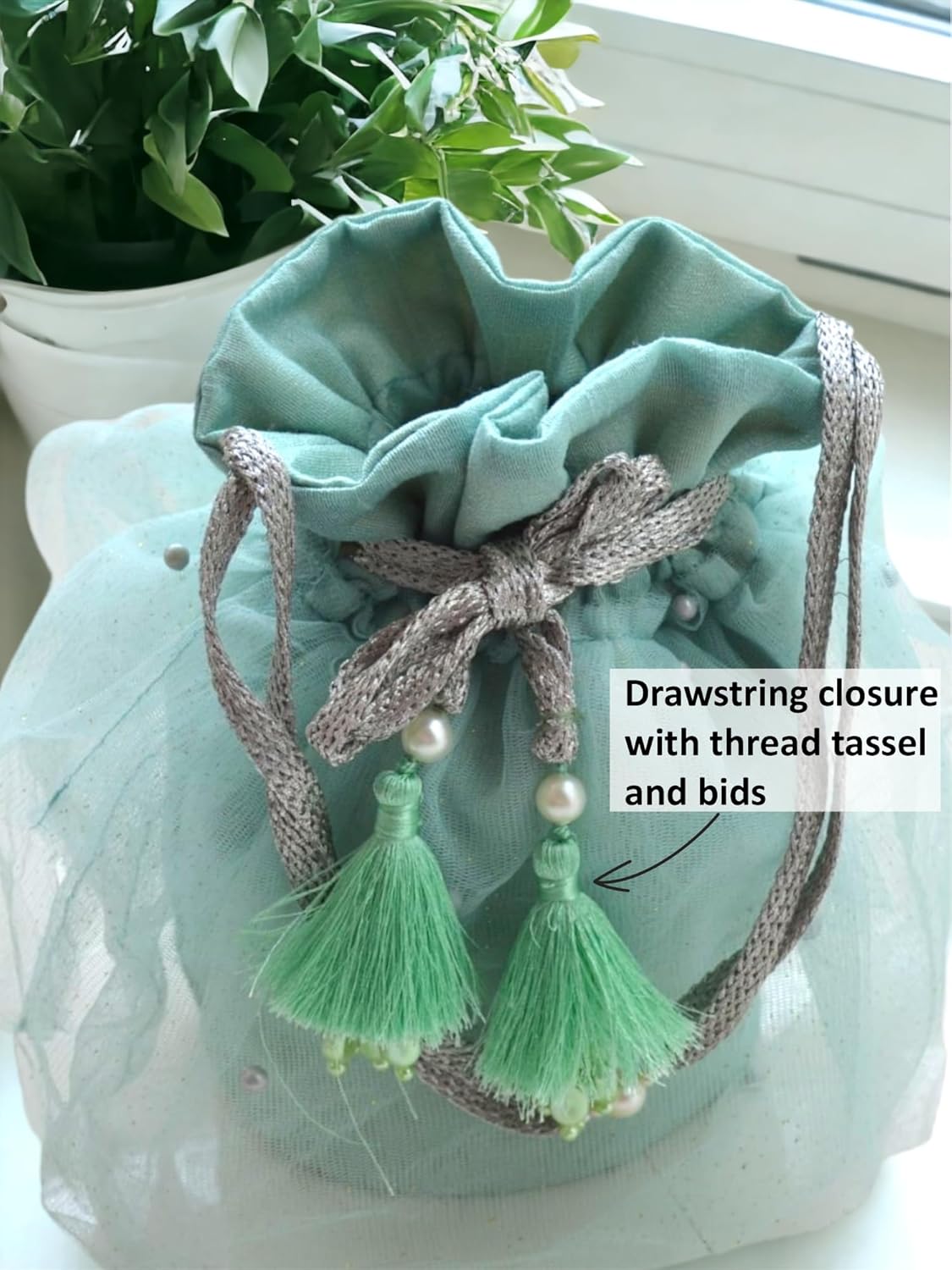 Introducing the ABC Exquisite Handmade Indian Batua Potli Bag, a masterful fusion of tradition and modernity that serves as a timeless gift choice or a chic accessory for various occasions. This exceptional piece showcases meticulous craftsmanship, featuring a delicate rose gold thread handle, an ornate designer tassel, and a contemporary 3-layered net adorned with lustrous pearls. Whether you’re a discerning bride in search of a captivating Wedding Clutch or an individual seeking an elegant return gift, this batua bag emanates an aura of grace and sophistication.