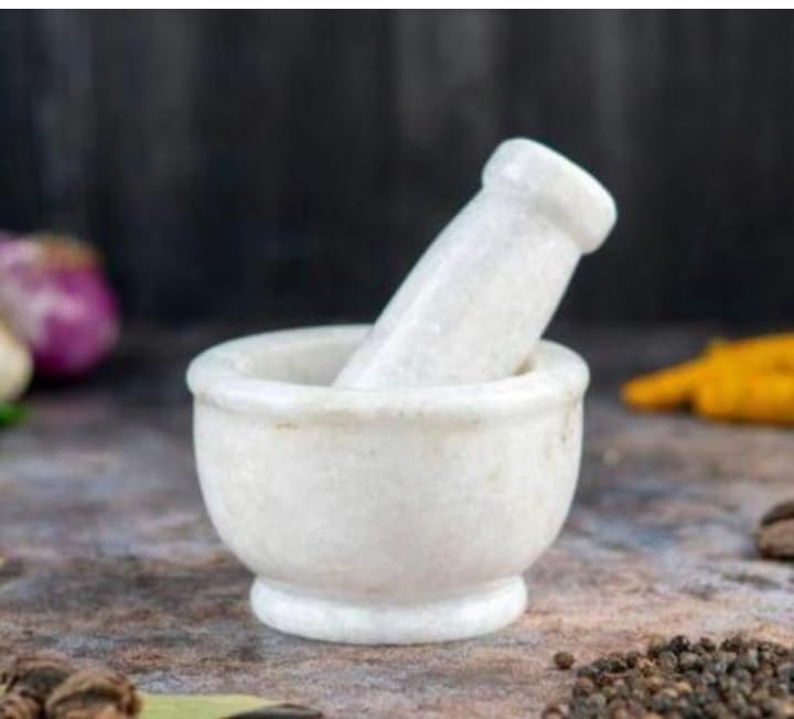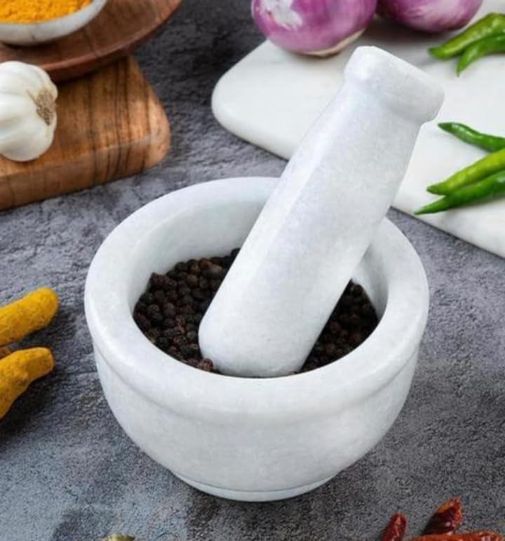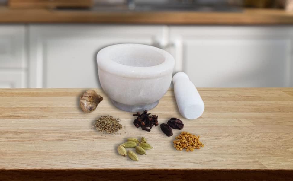 A marble mortar and pestle is a culinary tool composed of two parts: a mortar and a pestle, both crafted from solid marble. The mortar resembles a bowl with a smooth interior surface, while the pestle is a sturdy, rod-shaped implement used for grinding and pulverizing ingredients placed within the mortar. The marble material offers several advantages. Its dense, non-porous surface prevents the absorption of flavors and odors, ensuring that the natural essence of ingredients remains pure. Additionally, marble is highly durable and resistant to chipping, making it ideal for heavy-duty grinding tasks.This kitchen essential is versatile, capable of grinding herbs, spices, nuts, and seeds to desired consistencies. Its timeless aesthetic and classic design make it both a functional tool and a decorative accent.