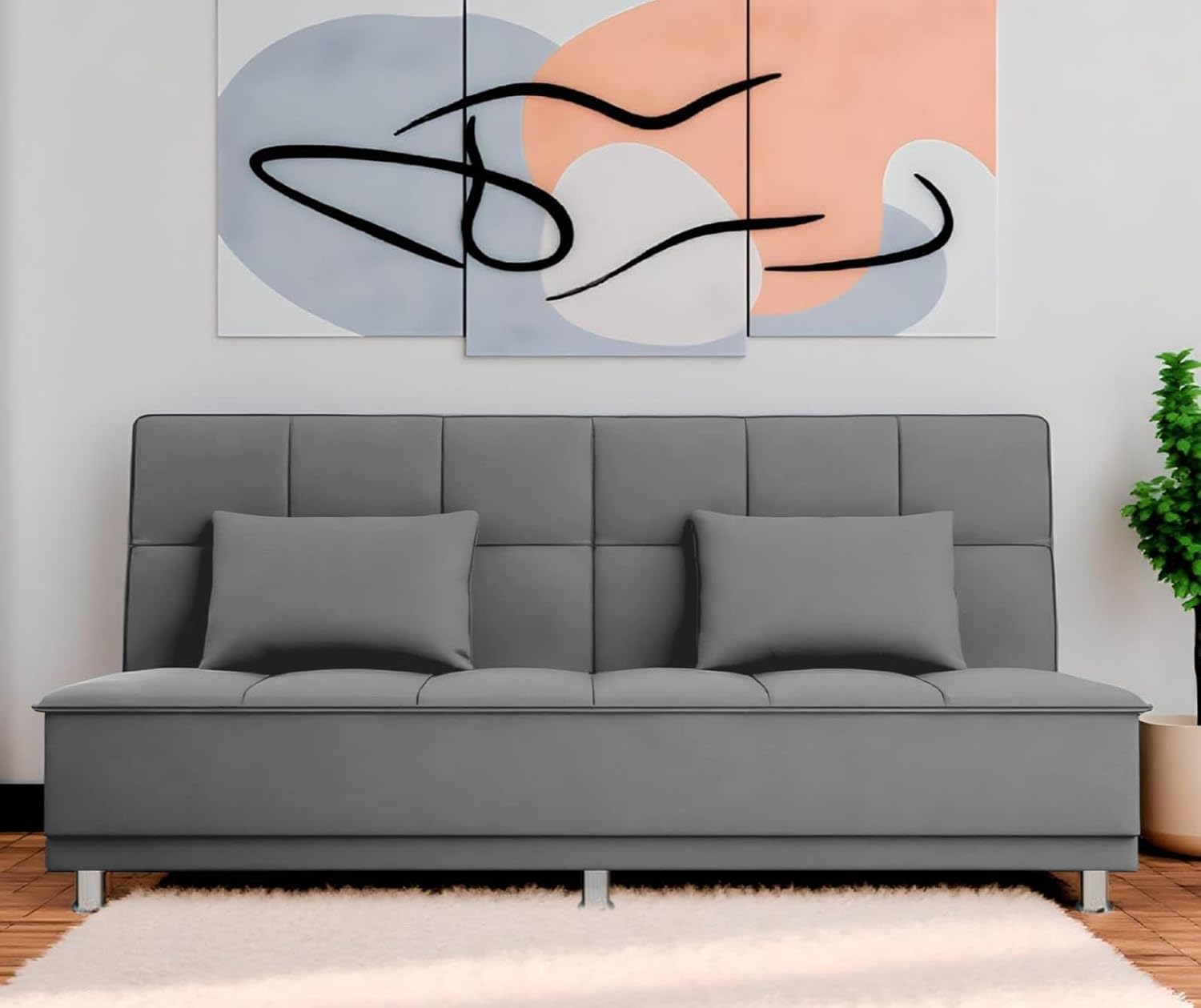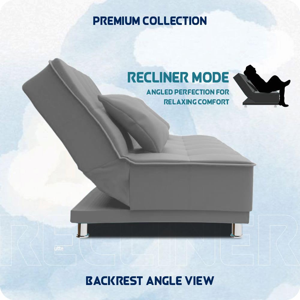 The Adorn India New Alyssum 3-seater sofa cum bed features plush velvet fabric, 40-density high-resilience foam, and durable elastic belts. Enhanced with industrial recron fiber back cushions, a solid wooden frame, and chrome steel legs, it offers style and stability. Its click-clack mechanism provides adjustable backrest positions—vertical, inclined, or horizontal—ensuring maximum versatility and comfort. Perfect for modern living spaces.