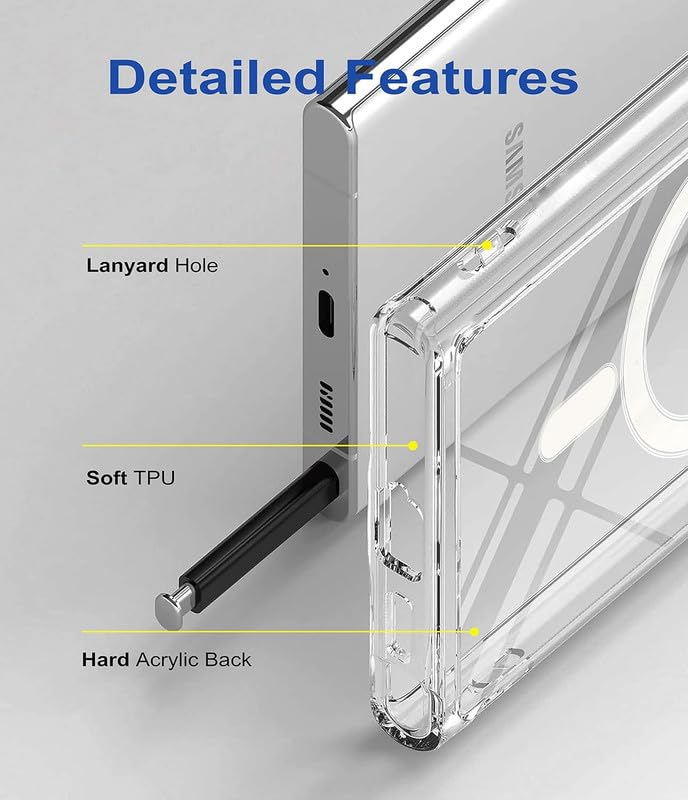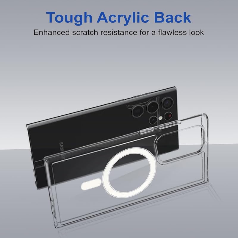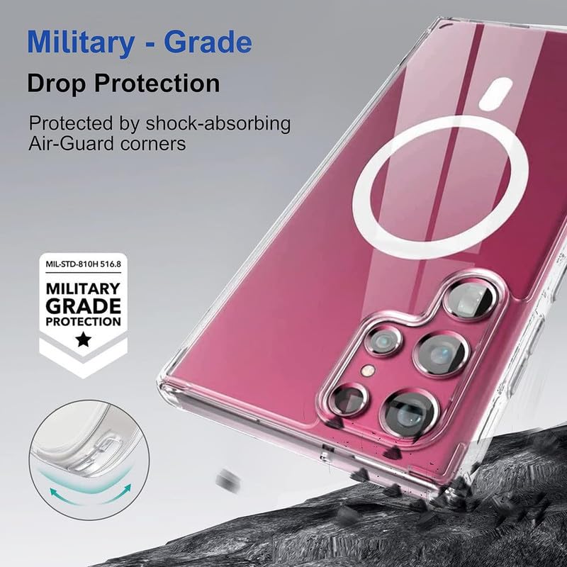 Experience lock-solid Magsaf performance and everyday protection—without hiding your phone’s design. This Magsaf case for Samsung S23 ULTRA integrates a precision-tuned magnet ring that delivers up to 1,500 g of holding force for faster, place-and-go wireless charging and a secure grip on Magsaf accessories like chargers, wallets, and car mounts. The rigid, crystal-clear hard back resists scratches and yellowing to keep your device looking new, while Air-Guard shock-absorbing corners provide military-grade drop protection. Raised edges around the screen and a Camera Guard lens frame keep critical surfaces lifted off abrasive tabletops. Despite the protection, the case stays slim and pocket-friendly—the back panel is just 1.5 mm thick and the total weight is about 1 oz, so it slides into pockets with ease. It also supports 360° rotation on magnetic mounts and is engineered not to affect cellular, 5G, Wi-Fi, GPS, or NFC performance—so you can game, stream, and navigate while charging.