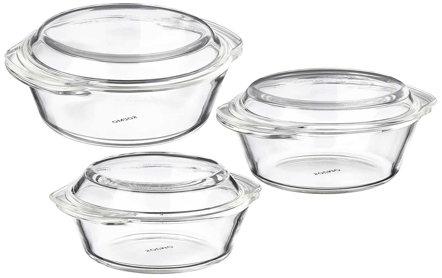 Amazon Brand – Solimo Borosilicate Glass Casserole-Cum-Serving Bowl with Lid | Set of 3 | Safe for Use in Oven and Microwave | Deep Round | 650 Ml + 1000 Ml + 1500 Ml | Transparent