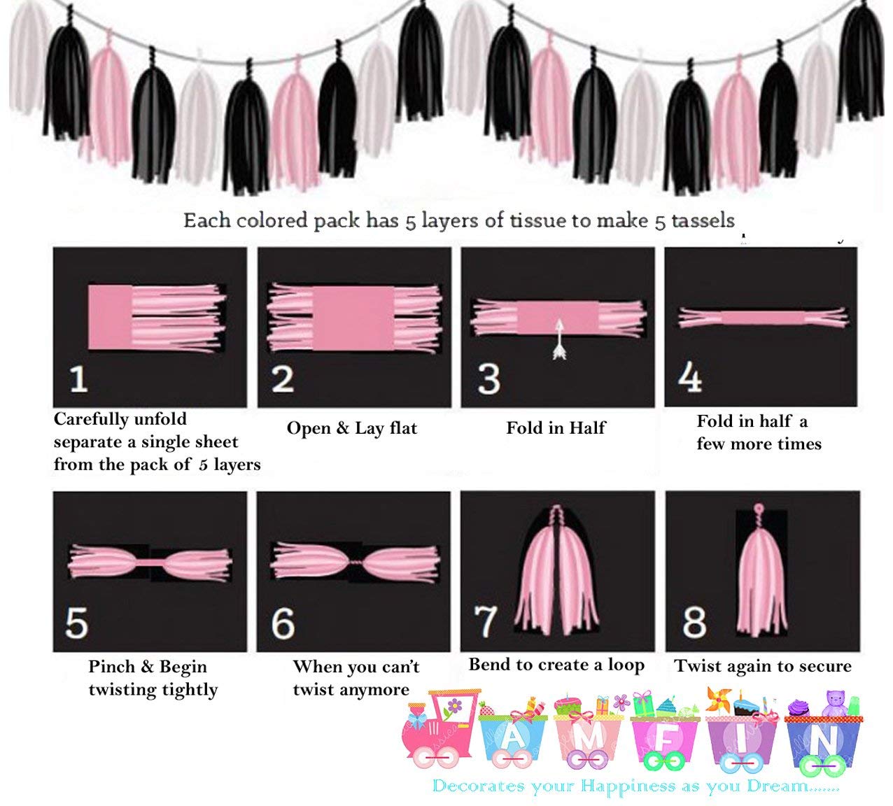 This garland / balloon tassel tail comes flat packed for easy self-assembly. Makes 2×5 large tassels. All tassels are pre cut and string and twine for hanging are included in the pack. Instructions for assembly are placed on the back of the packet.