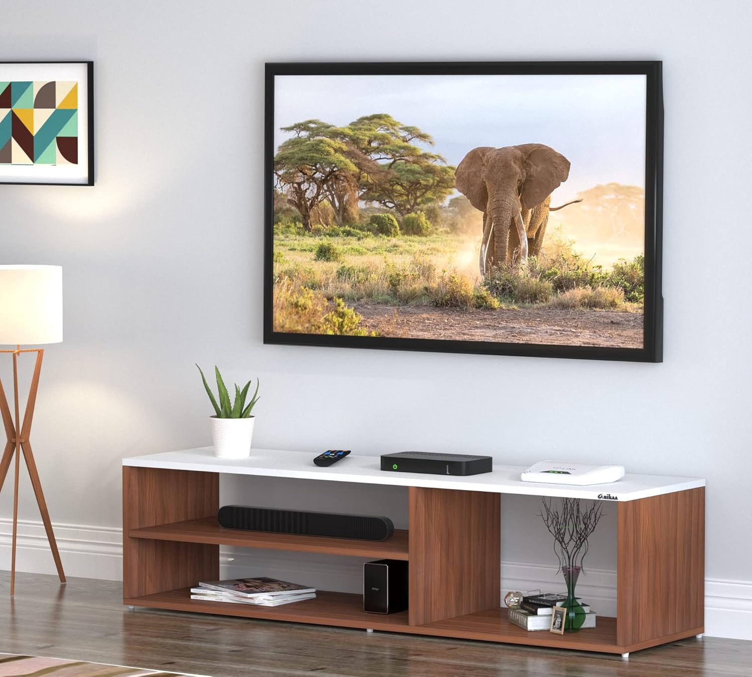 An eye-catcher constructed in an attractive contrasting color and intellectually created in scratch-resistant premium engineered wood with cabinet, and shelves paving the way for ample storage for your set up box, DVD, books, documents, etc. It is versatile form and rich finish allow it to blend effortlessly with the rest of your cor. Smooth edges, resistant to humidity with gorgeous aesthetics and functional storage utility.