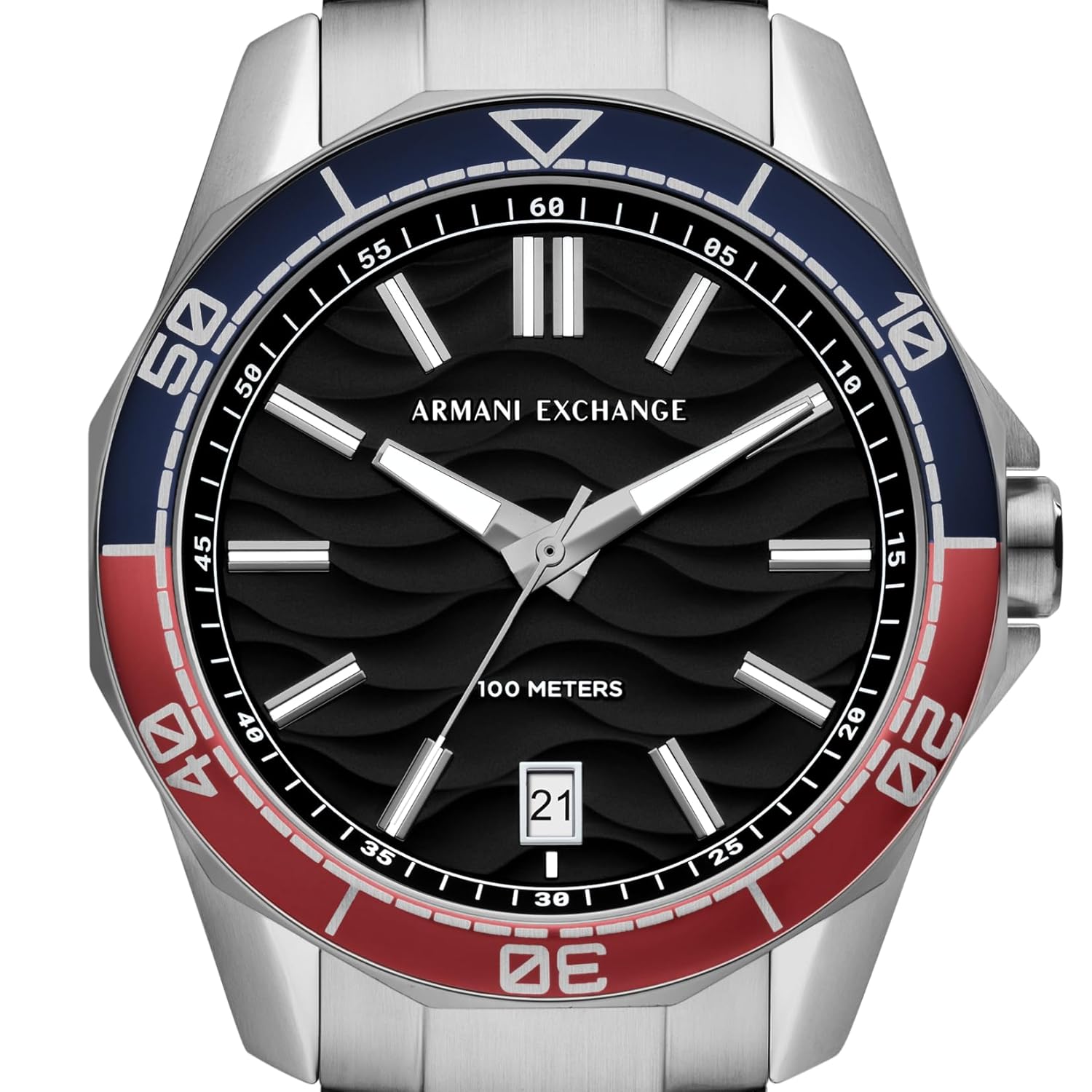 Armani Exchange’s 44mm watch features a black wave-inspired textured dial, 100 meter water resistance, three-hand date movement and stainless steel bracelet.