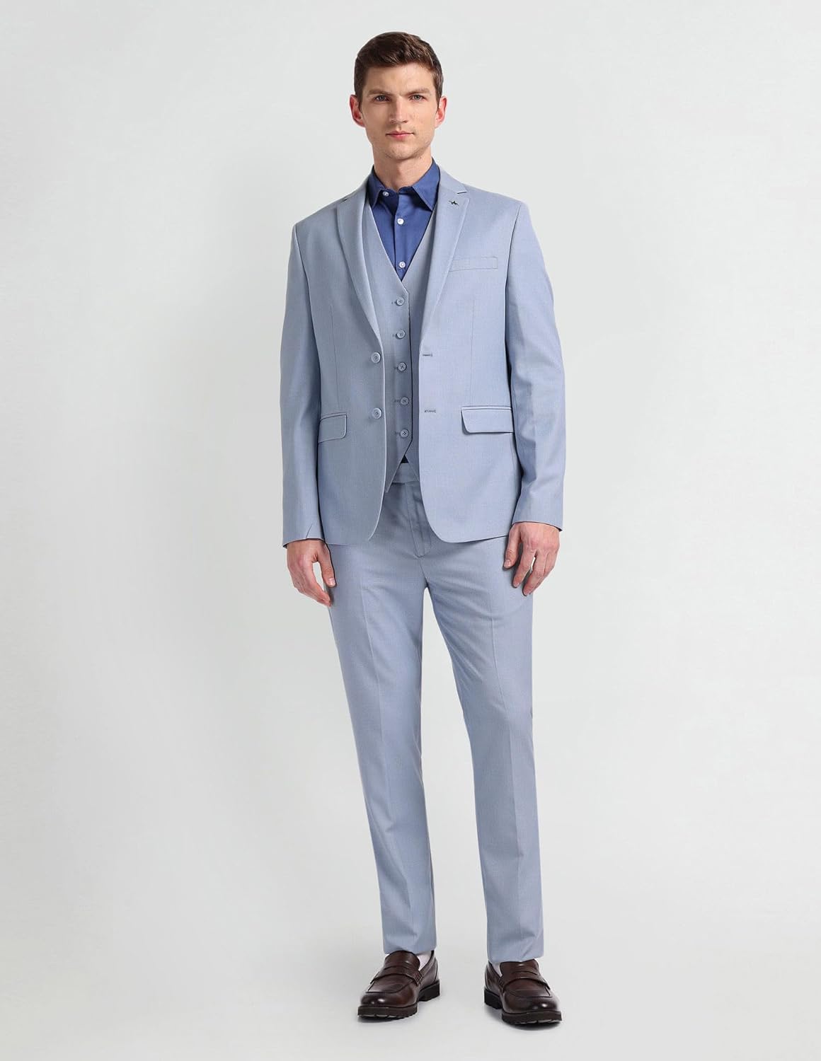 Elevate your formal wardrobe with this sharp three-piece suit from the experts at Arrow and It’s been excellently tailored with a notch lapel collar blazer and a pair of streamlined trousers.