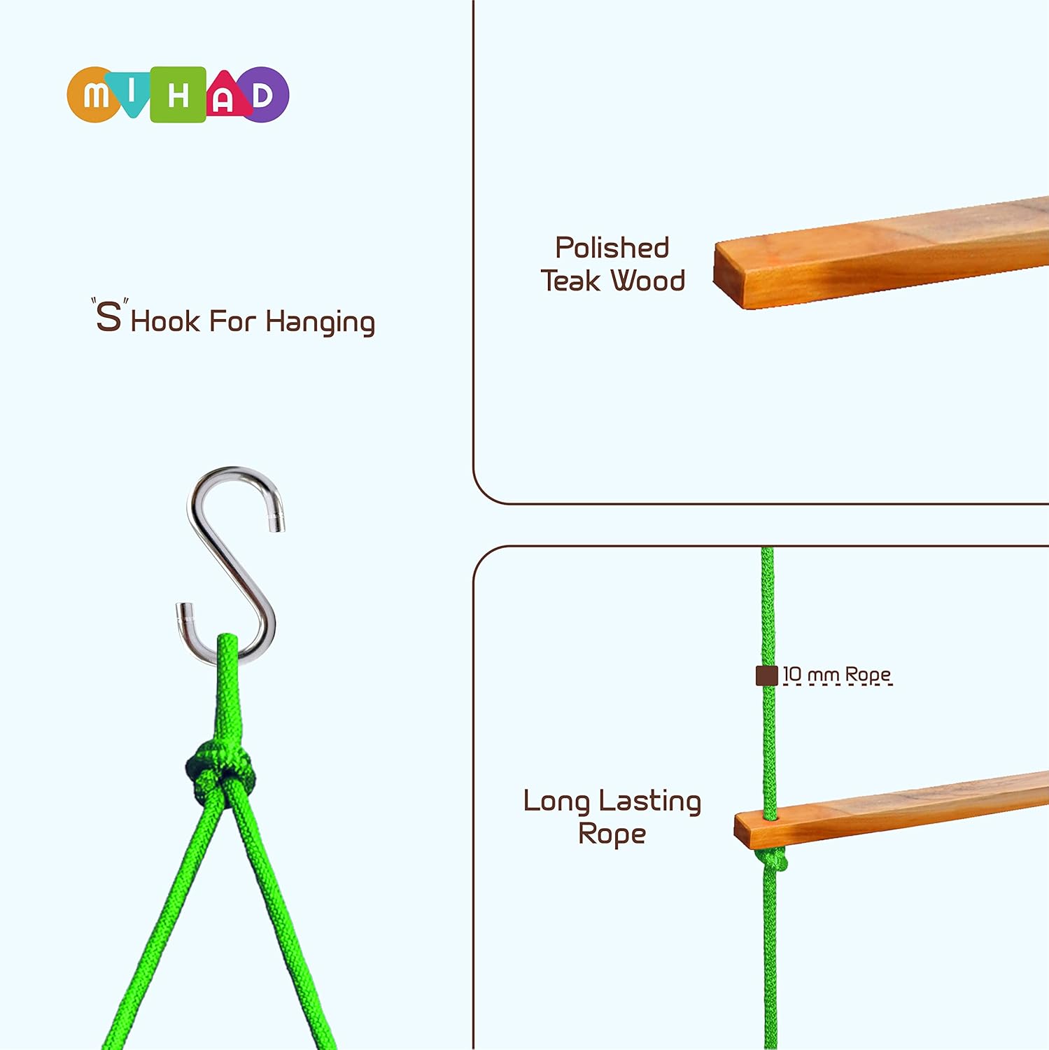 - Made of 7 wooden stick attached with a nylon rope for climbing. Complete with “S” Type hook for hanging. Easy do it yourself installation for quick backyard fun.