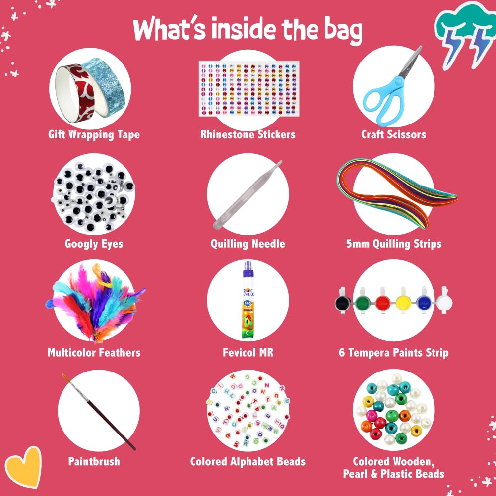 ✅ WHAT IS INSIDE THE BOX: 50 Pcs pom poms, 25 Pcs colored sticks, 25 Pcs natural sticks, 10 Pcs wooden clips, 5 Pcs paper straws, 10 Pcs pipe cleaners, 3 Pcs felt sheets, 3 Pcs foam sheets, 5 Pcs origami sheets, 3 Pcs printed sheets, 1 Pcs satin ribbon, 1 Pcs plastic ribbon, 2 Pcs gift tapes, 100 Pcs rhinestones, 1 Pcs scissors, 25 Pcs googly eyes, 100 Pcs quilling strips, 1 Pcs needle, 25 Pcs feathers, 6 Pcs paints, 1 Pcs brush, 100 Pcs beads, threads, sequins, glitter, 1 Pcs bag & user guide.