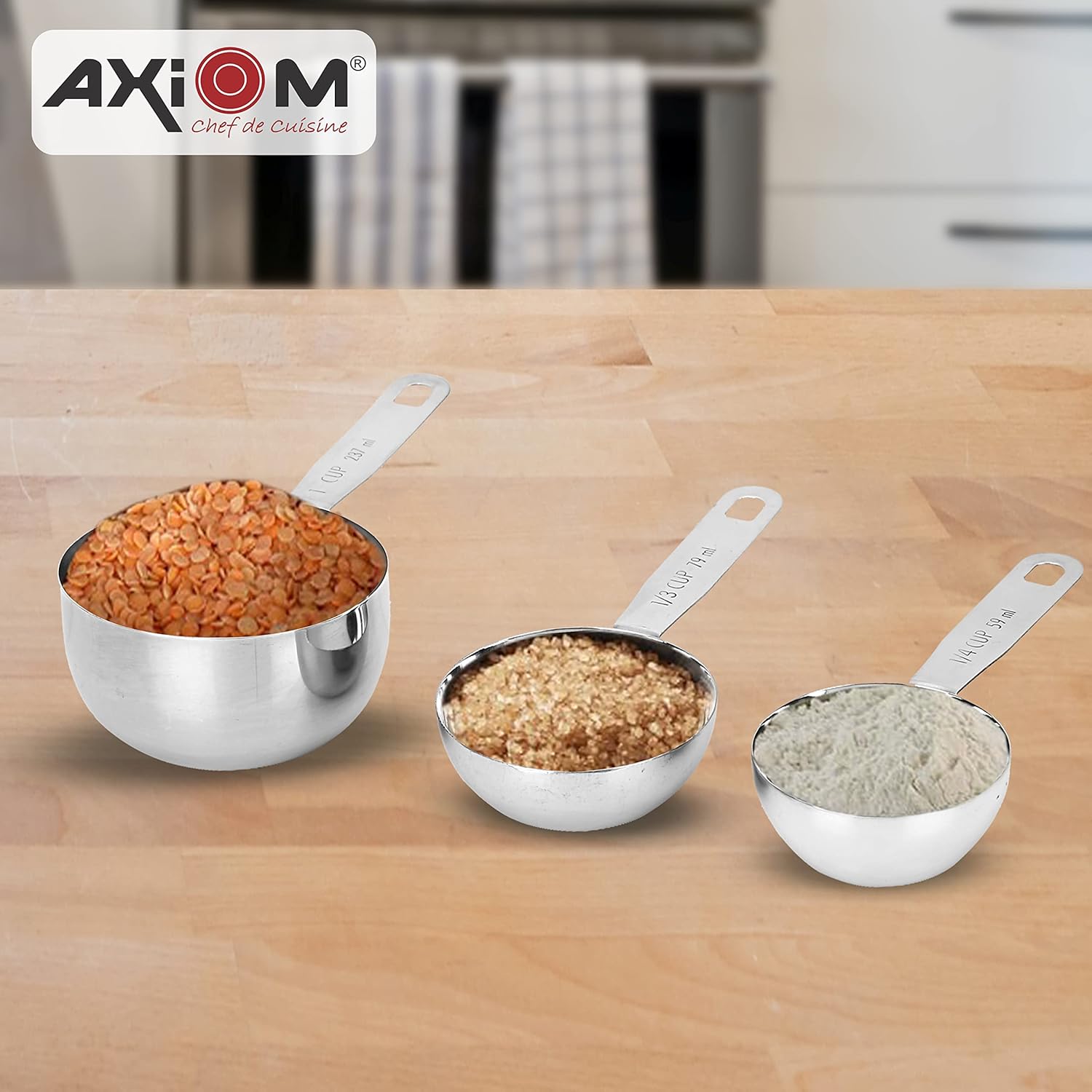 Measuring sets are made of Anti rust and toxin free food grade stainless steel. 1 cup, 1/3 cup, 1/4 cup, 1 tablespoon, 1 teaspoon & 1/4 Teaspoon for accurate measurements of ingredients