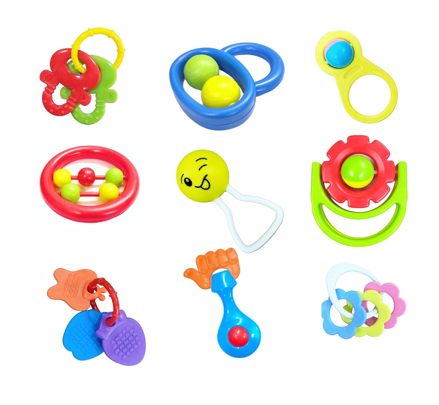 RATTLE FUN: Each item in the set has a unique way of producing rattle sound and conducting fun filled activities, Also each of the toys has ample gripping space for your Baby to hold the toy in their own cute way while playing.