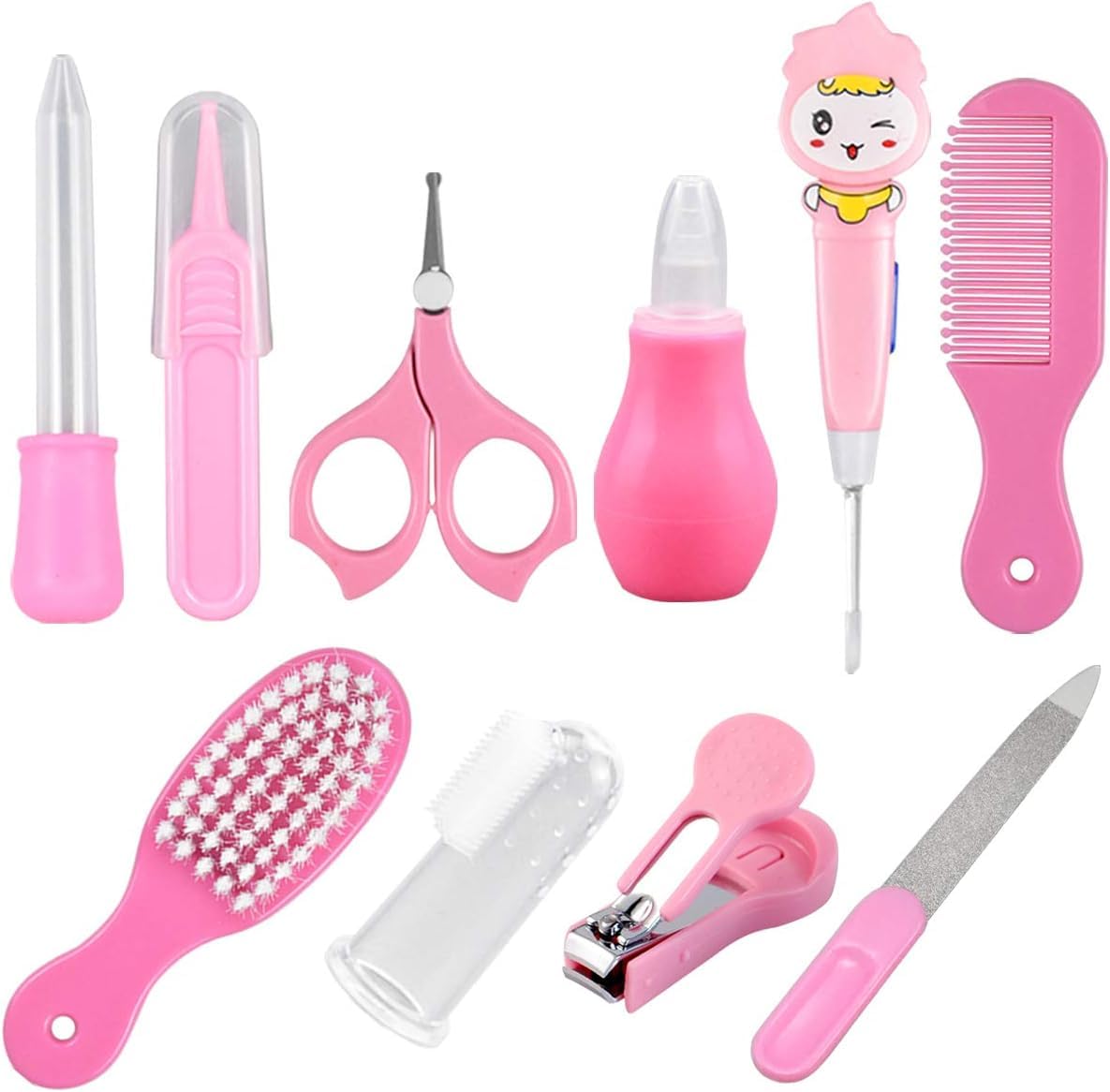 [Package Includes]: 10 pieces of baby care set, stored in a carton for easy storage and organizing. 【Full Set】: Scissors, brush, comb, nail file, mini nail clippers, medication feeder dropper, nasal aspirator, tweezers, ear spoon with light, finger toothbrush. 【Safe Design】: All these small tools are smooth and round in the tips, so to avoid the happening of potential hurts. Other unique details are specially designed for safer use. 【Helper for Mother】: Suitable for daily cleaning and health care for baby, infant, toddler, as well as kids. The baby grooming set are used to prevent the nails scratching, hair knots, etc. 【Material】: Made of ABS and metal material, in pink color. Harmless and safe for baby and kids.