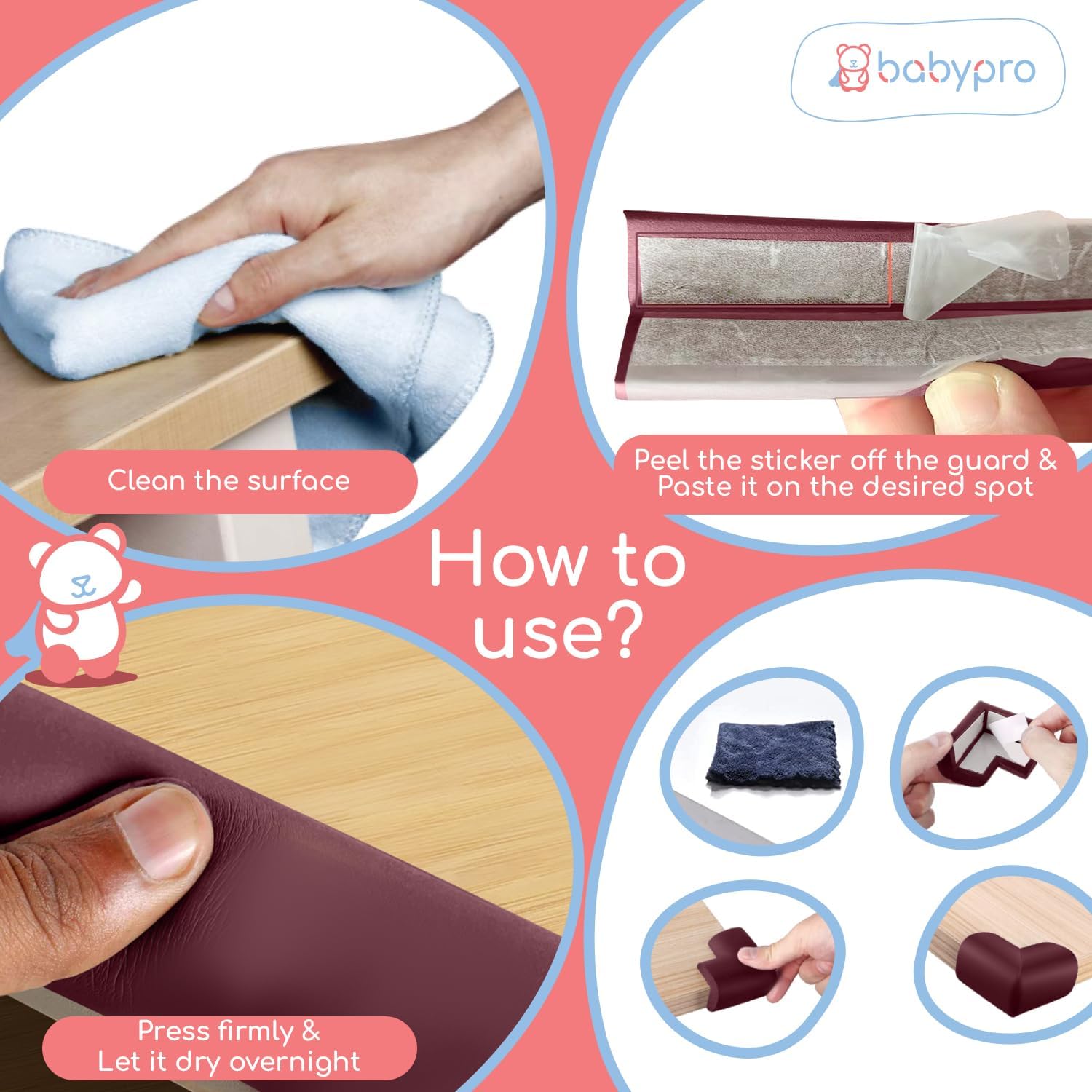 About BabyPro! BabyPro is India’s most trusted and certified brand that offers baby safety products and helps you baby-proof Indian homes. It is trusted by more than 20,000 parents across India including celebrity moms Shilpa Shetty and Neha Dhupia. We at BabyPro strongly believe that the general well-being of a child is driven by a child-friendly home. Our mission is to make your home safe for kids by preventing unavoidable accidents and injuries. We value all our partners’ and customers’ requirements and believe in establishing a collaborative ecosystem with all entities helping us to bring functional products at the best prices for all. About BabyPro – Corner Guards Bring home the amazing combo of BabyPro baby proofing corner guards and edge guards and give world-class safety to your home! The product will help you ensure that your toddlers and babies can freely roam around the house. Apply it on wood tables, glass, chairs, and other sharp objects in less than a minute and make your home a bump-free zone. Key Features: Design: Elegantly designed guards with high-density foam cushions that protect babies and seniors from injuries and self-adhesive tape for covering sharp edges & corners of the glass, steel, metal, and wooden furniture Secure Adhesion: The childproofing edge & corner guards come with a strong adhesive that is built to be strong even in the toughest conditions, is easy-to-peel, and provides secure adhesion Reliability: BabyPro corner protectors won’t damage furniture and are easy to remove Safety Certified: Engineered to provide world-class safety to your toddlers and babies so that they can freely roam around the house.