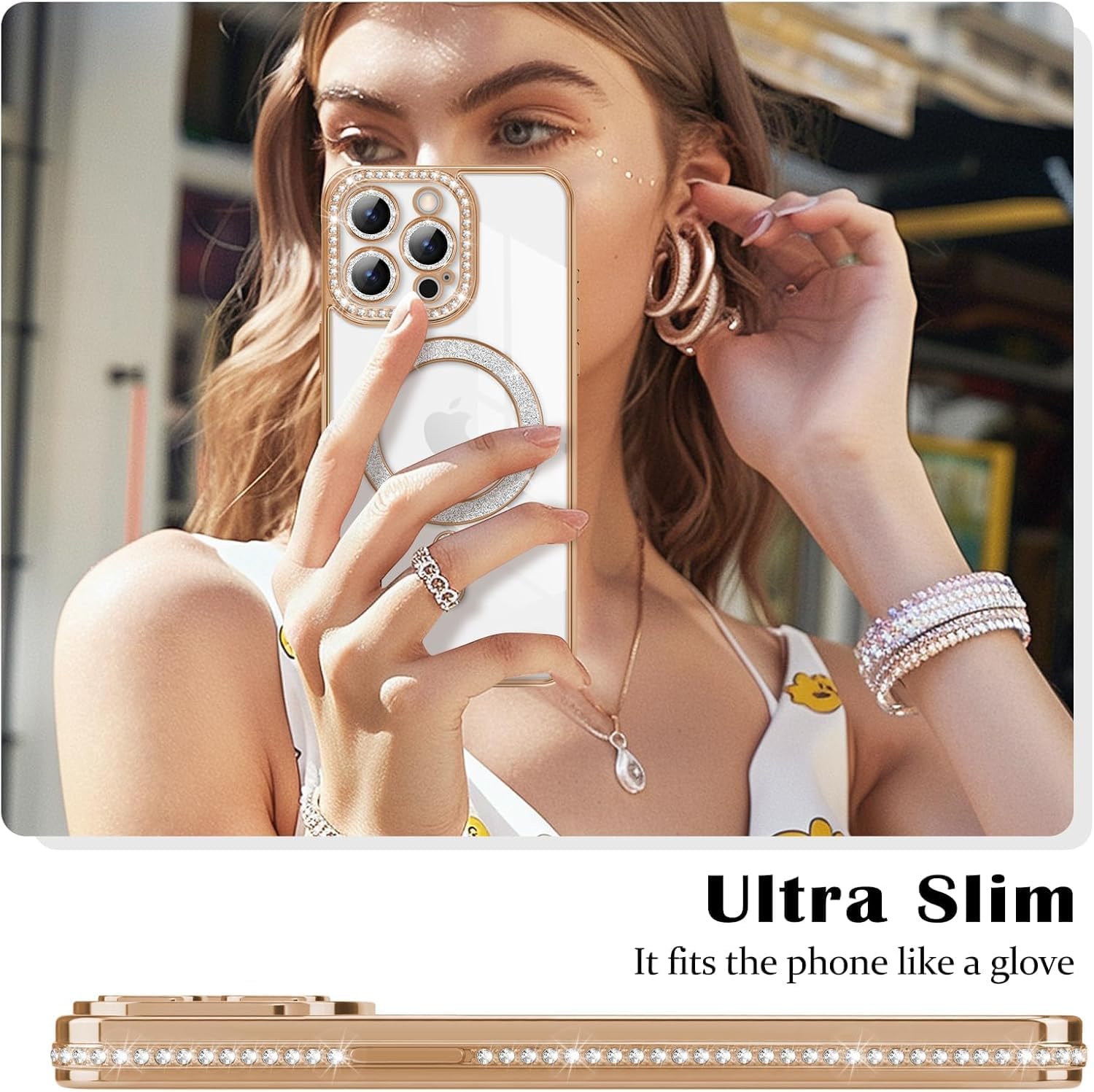The Bling Diamond Rhinestones Plated On Camera Lens,Both Side Of Cover & Magsafe Circular, Making it particularly Eye-Catching.