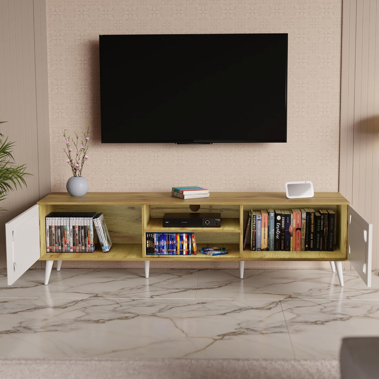 Bring home a TV unit that?s as stylish as it is practical. The warm wooden finish pairs beautifully with the clean white doors, giving your living room a fresh, modern look. With open shelves for your TV gadgets and two spacious cabinets to tuck away the mess, it keeps your space neat while adding a touch of charm. Simple, elegant, and built to blend in with any dcor.