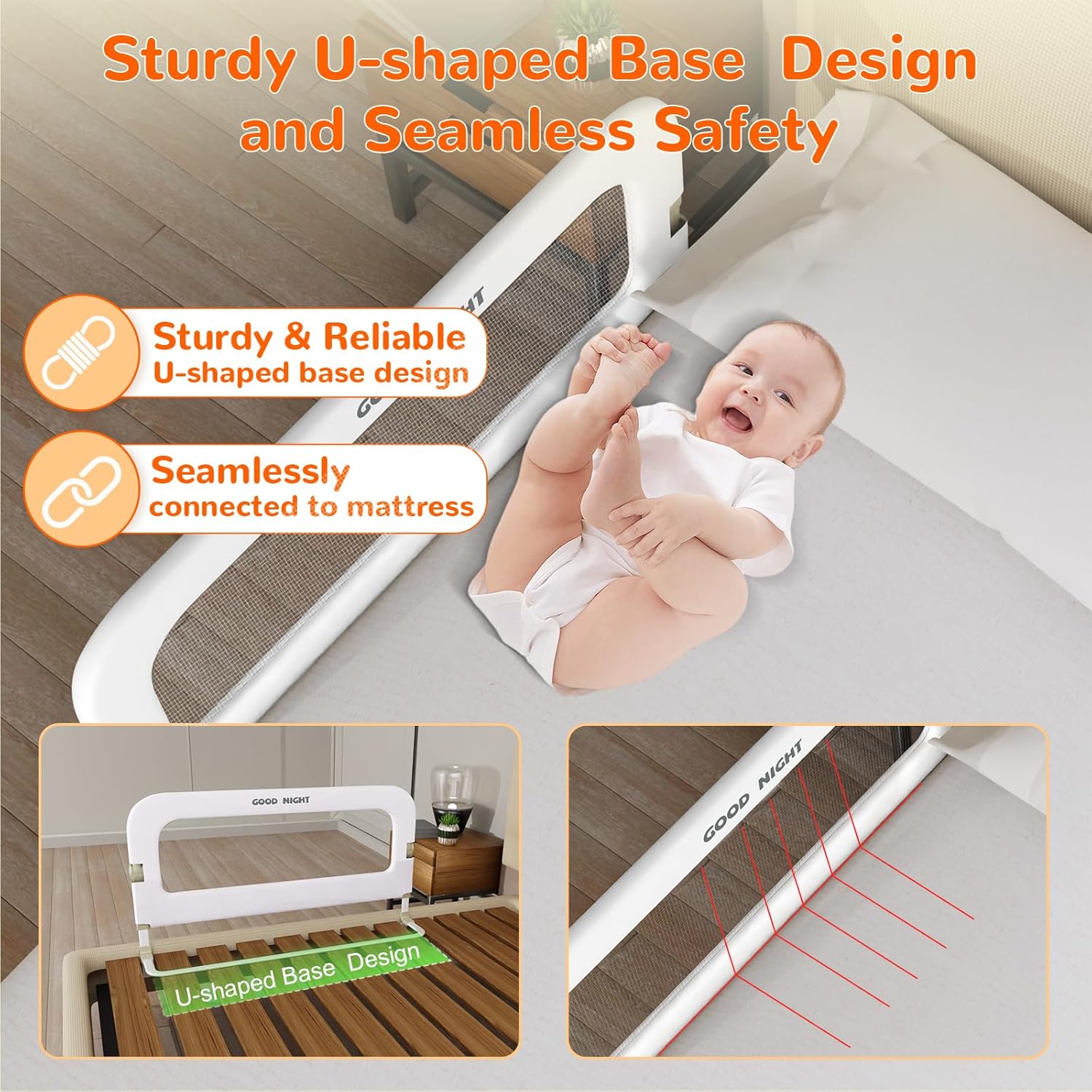 【Sturdy & Stable U-shaped Structure】Compared to traditional cot rails, the Deeteck bed rail is designed with a U-shaped structural base that allows for a larger force area, increasing stability and safety. It also uses a high quality S-grade steel frame structure to make the steel tube connection tighter. The seamless design presses tightly onto the mattress to avoid sliding and shifting of the base, so you don’t have to worry about your baby getting stuck or falling off the bed, creating a safe and comfortable sleeping environment for your baby.