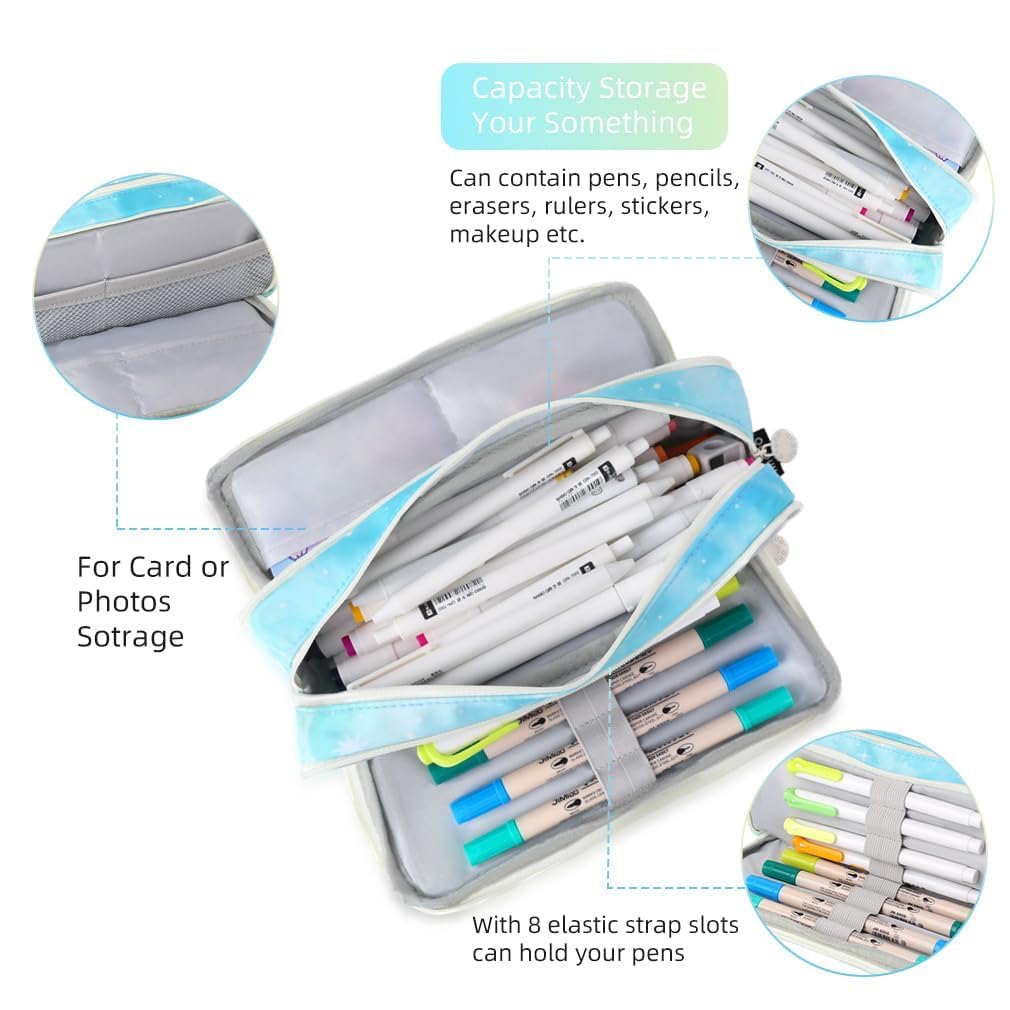 Big Capacity Pencil Cases with Compartments Pouch Aesthetic for Kids Teen Students, Expendable Stationery Organizer Pen Bag for College School Office (Rainbow Blue)