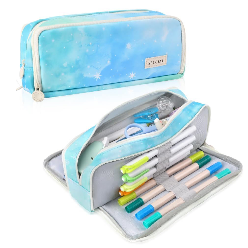 Big Capacity Pencil Cases with Compartments Pouch Aesthetic for Kids Teen Students, Expendable Stationery Organizer Pen Bag for College School Office (Rainbow Blue)