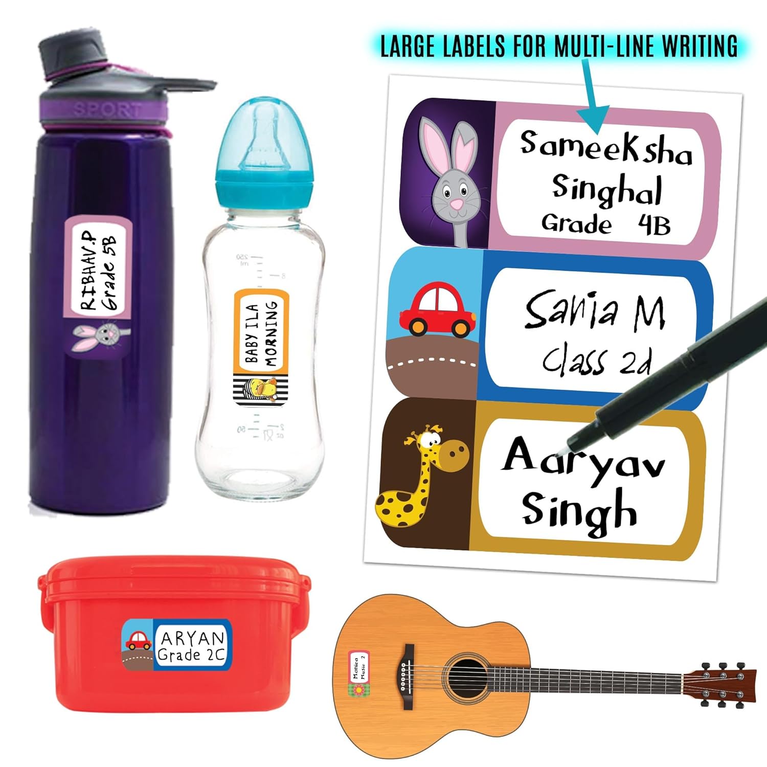 Set of 60 School Labels: 36 Book Labels + 24 Writable Waterproof Labels in 3 sizes to label all school stationery items including, water bottles, snack boxe, pencil cases etc.
