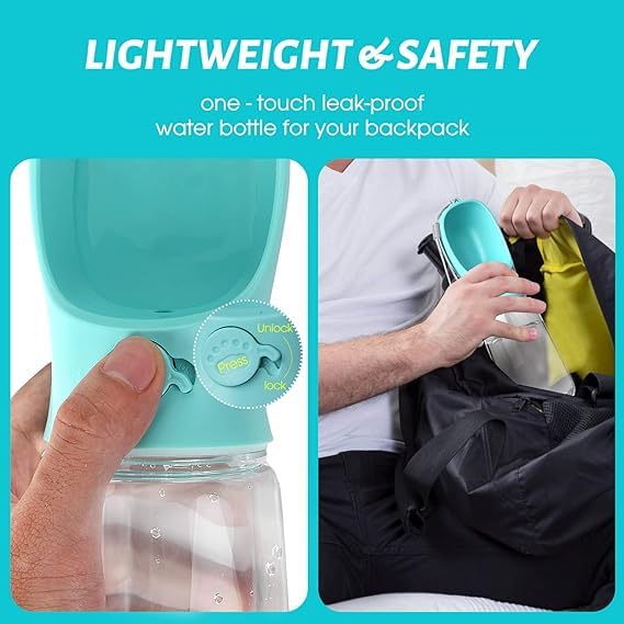 【Upgraded Bigger Capacity】: water bottle can hold max 19 ounces (550 ml) of water and 100 g food. It not only ensures dog drinking water easily but also cat, rabbit or other small pet to drinking water easily. You can put this bottle into your pocket, backpack or hanging on your hand with sling rope.