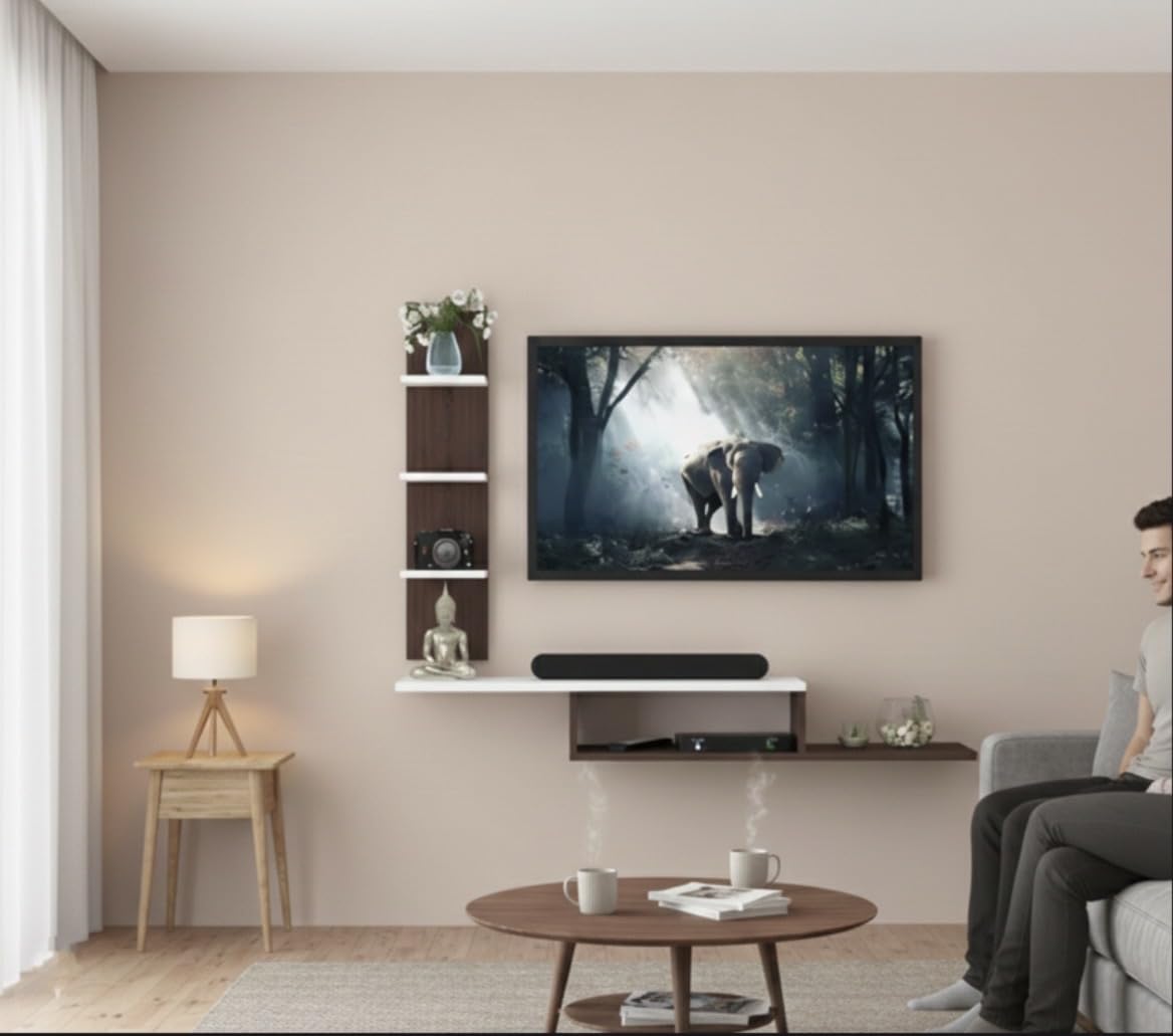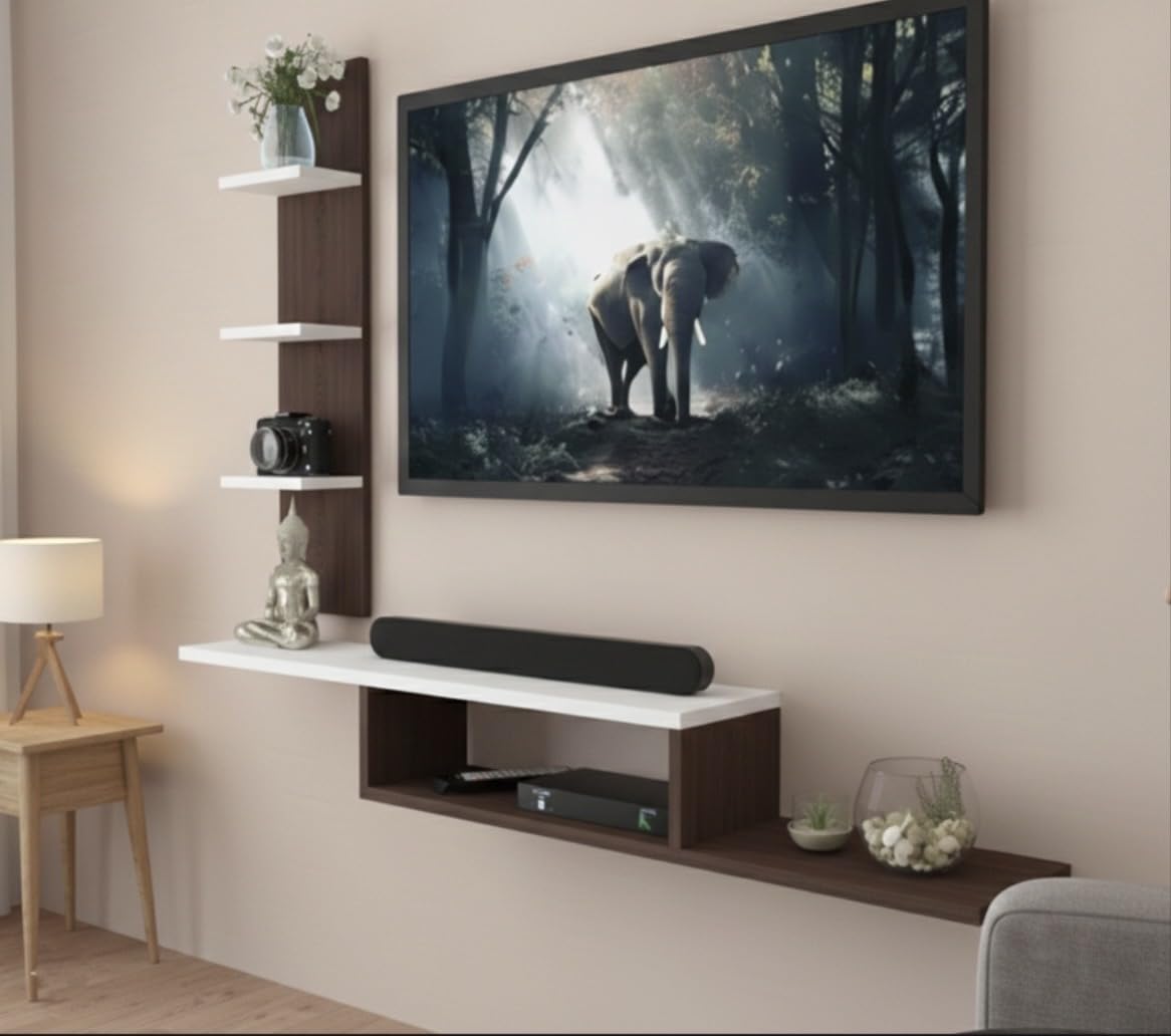 Upgrade your living space with the Bros Moon Wenge White Premium Engineered Wood Floating TV Unit, designed for modern and compact homes. This wall-mounted TV unit best supports TVs up to 32 inches and offers a sleek floating design that saves floor space. It includes a spacious open base drawer for set-top boxes and accessories, three open storage shelves for décor, speakers, or books, and a decorative display shelf for styling. Made from durable engineered wood, this living room TV unit ensures strength, stability, and long-lasting use. Perfect for contemporary interiors, it combines functionality, storage, and elegant design.