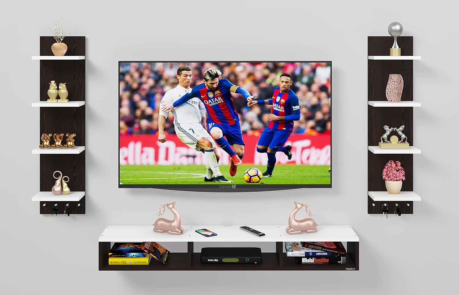 This is a multiple unit set which includes 2 vertical and 1 horizontal shelf which gives a modernized look to your place. You can keep your books, decorative items, essentials etc in an organized manner. 4 hangers each are present under each side shelf on which you can hang keys ,masks, etc. It will give an elegant & enticing look which will elevate your living area or entertainment center with ambience. A modern and sophisticated take for showcasing your TV, media accessories and beyond.