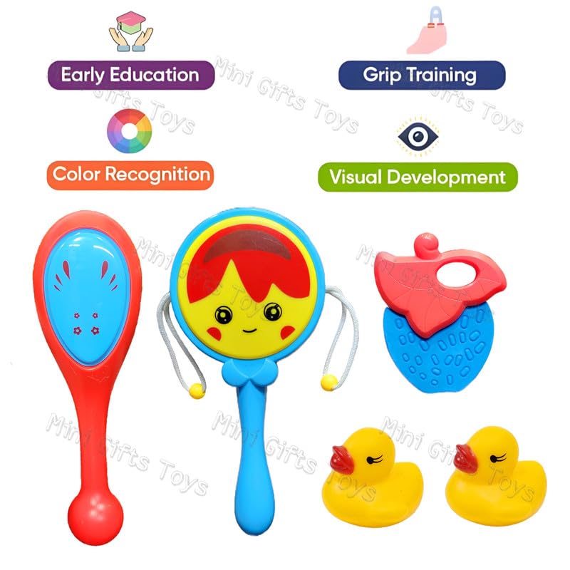 Toys floating on the surface of water include duck. Baby Rattle Is Made Of BPA-free Abs Plastic, Ensuring It Is Safe For Babies To Put In Their Mouths Or Chew On. They stimulate the imagination and encourage tactile exploration. Designed to help strengthen baby’s sensory, hand-eye coordination skills with a variety of colors, sizes and a unique design. Shaking the rattle and pressing the rubber toy produces a melodious and attractive sound which works as a beneficial tool for babies. The rattles and rubber toys are just the right size for little hands, eliminating the risk of accidental swallowing. Rattles and rubber toys of different colors are suitable gifts for newborn babies. Since it is lightweight, it is easy for parents to carry their kids during travels.