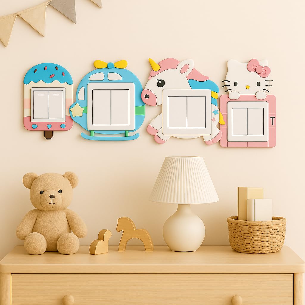 ADORABLE CHARACTER DESIGNS – This pack includes four fun and colorful light switch covers featuring popular kid-friendly themes: Unicorn, Helicopter, Hello Kitty, and Popsicle. Each design is crafted to spark joy and creativity, making them the perfect addition to any child’s bedroom, nursery, or playroom.