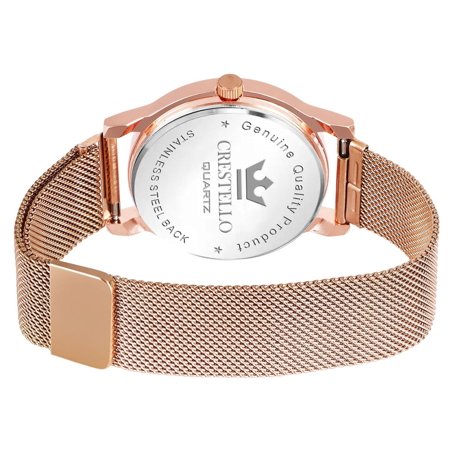 The wristwatch’s band is made up of good-quality rose gold plated mesh metal.