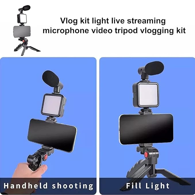 The vlog kit include Three-level brightness adjustment LED fill light (without battery, need to purchase AA A battery separately),mobile phone holder,tripod,Optional split G5 microphone,cell phone line,two transfer wires,remote control Can control taking pictures and recording videos (without battery, need to purchase 2032 battery separately).perfect for vlogging, live streaming, travel.