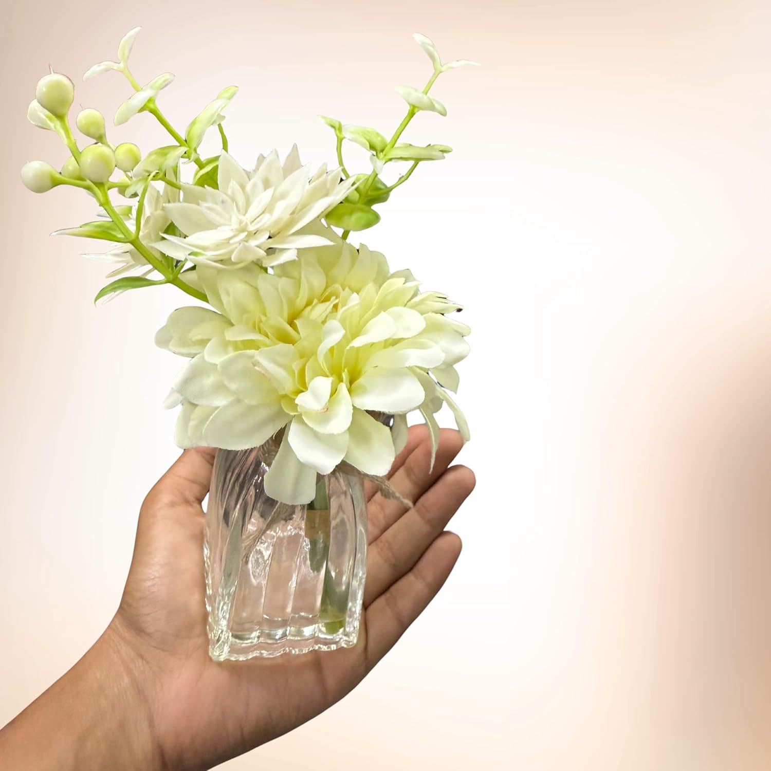 Enhance your living space or office with the elegant Curated Cart Artificial Flower Bouquet — a beautifully crafted arrangement featuring realistic white blooms and lush green foliage nestled in a clear glass vase. This maintenance-free decorative piece brings a fresh, natural vibe to any room without the hassle of watering or sunlight. Each flower is made from high-quality fabric and plastic materials that replicate the soft texture and vibrant colors of real flowers. The sturdy glass vase adds a sophisticated touch while securely holding the bouquet in place, making it perfect for display on desks, shelves, dining tables, or countertops. Ideal for those who want to enjoy the beauty of flowers year-round, this bouquet requires zero upkeep and won’t wilt or fade over time. It’s an excellent choice for home décor, office accents, wedding decorations, or thoughtful gifting for housewarmings and birthdays. Add a timeless charm and effortless elegance to any space with the Curated Cart Artificial Flower Bouquet a perfect blend of style and convenience designed to brighten your environment every day.