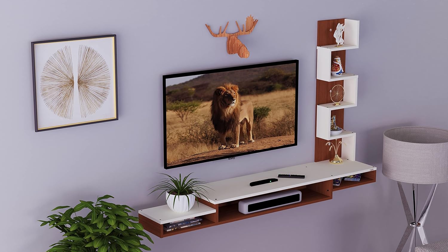 TV unit shelf is a perfect wall mounted entertainment center for your living room which adds a touch of elegance and sophistication to your decor theme to make your home classy and stylish. The contemporary, high-end designer look of this wall mounted media console will free up space and give your living room a light, airy look.