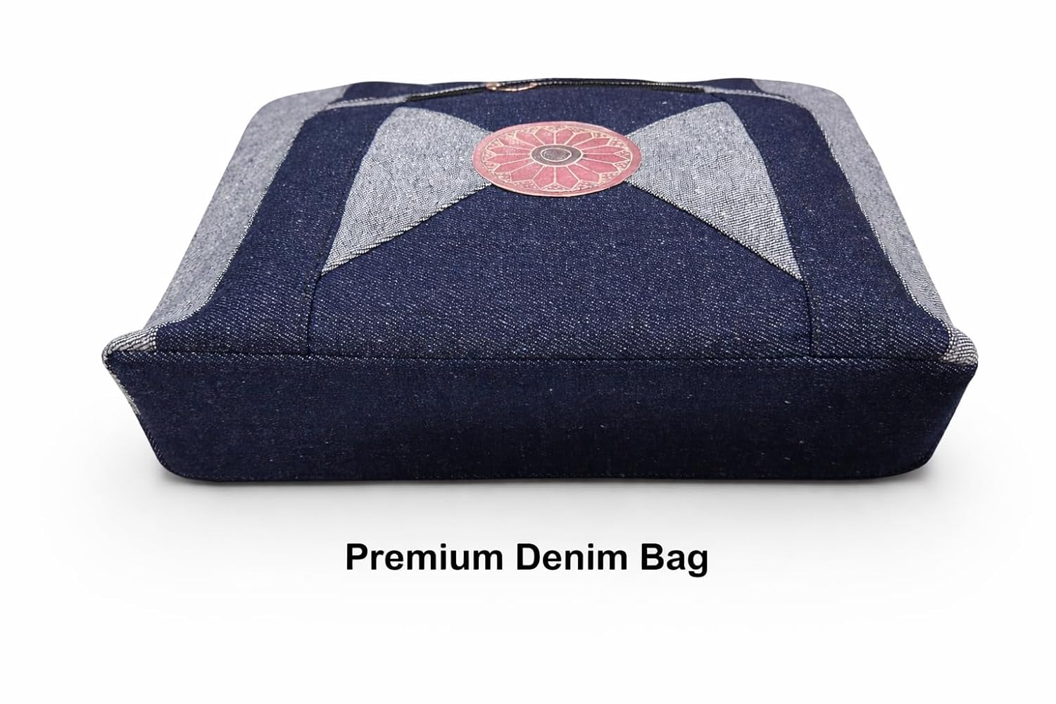 This stylish denim tote bag combines fashion and functionality for the modern woman. Crafted from durable denim fabric, this handbag features an eye-catching blue patchwork design with contrasting shades that create a sophisticated geometric pattern. The distinctive decorative medallion at the centre adds a unique artistic touch that sets this bag apart. Measuring 35.5 cm in height and 35.5 cm in width, this spacious tote offers ample room for your daily essentials, making it perfect for office, college, shopping trips, or casual outings. The convenient front zipper pocket provides quick access to items you need frequently, whilst the sturdy shoulder straps ensure comfortable carrying throughout the day. The two-tone denim construction not only looks elegant but also promises long-lasting durability. Whether you’re heading to work, attending classes, or running errands, this versatile shoulder bag complements both traditional and contemporary outfits effortlessly. Its practical design and stylish appearance make it an essential accessory for women who appreciate quality craftsmanship and timeless style.