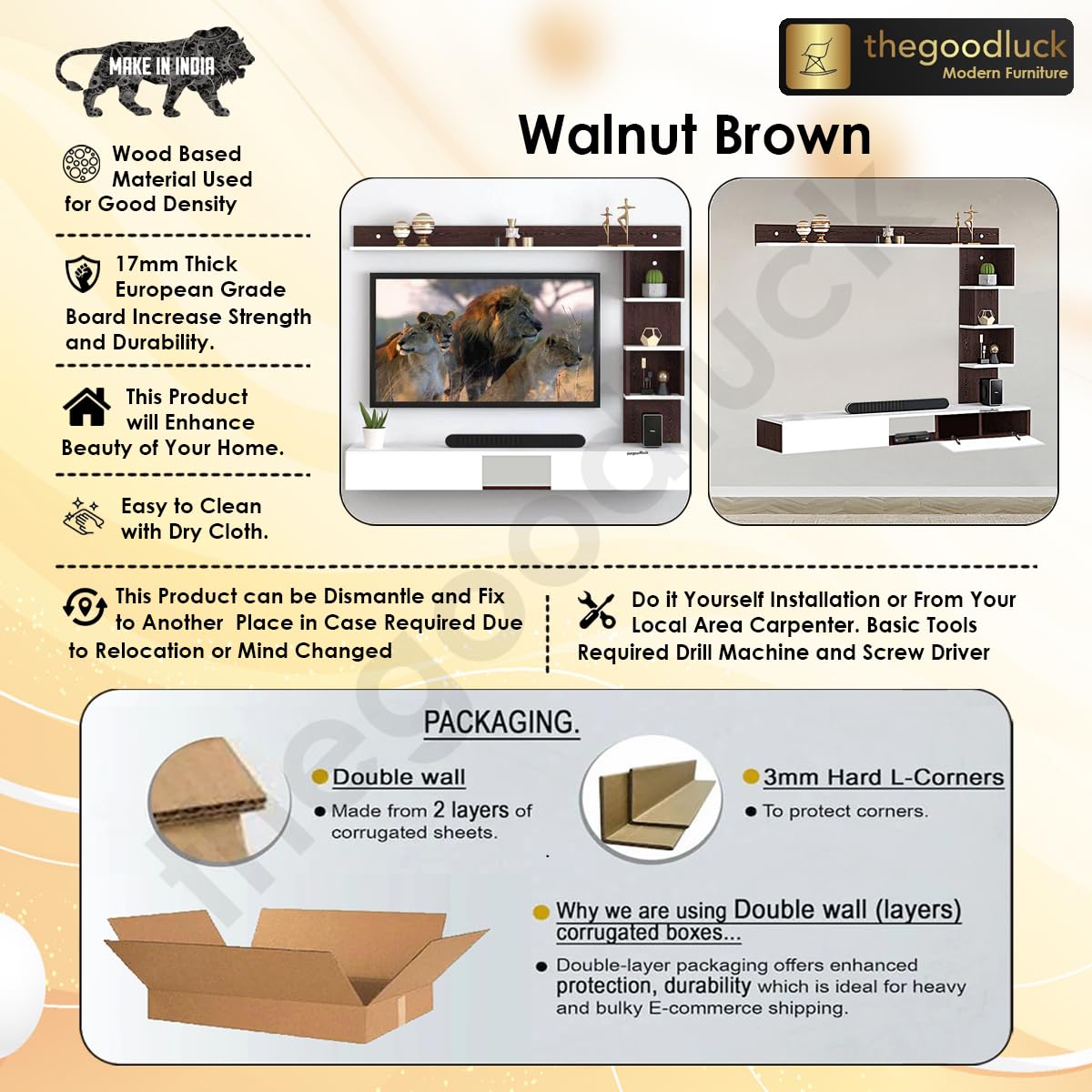 A wall-mounted TV cabinet, TV Furniture, TV Showcase, TV Unit, TV Stand, Wall Entertainment Unit is a furniture piece designed to hold a television and provide storage space for media devices, cables, and other related items. It is specifically designed to be mounted on a wall, saving floor space and creating a sleek and organized look in a room. Wooden Type 17mm Thick Engineering Wood Action Tesa Branded (European Standard Environment friendly – Made from Solid Wood Chips) This is a DIY Self Installation product means you need to do installation yourself or arrange carpenter at your own cost for installation. the product comes with hardware and assembly guide. if you’re not able to find a carpenter then we can help you to find a local area carpenter for installation for you. the charges you can pay directly to him.
