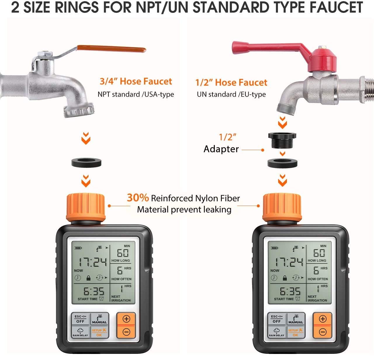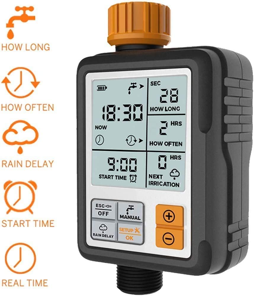 ✔️ CONTENT: Automatic Water Timer Controller Digital Clock Black and Orange scheduler + 1/2 & 3/4 inch thread adapter + Batteries + 16mm Output Connector. 3″ extra-large screen makes everything clear at a glance. What’s more? The screen will automatically go on sleep mode if the soaker hose timer does not operate after the 30s. The powerful chip will detect a low power supply and shut off the hose timer before the battery dead. Only 2×1.5 V AA Alkaline batteries must be used. No “Rain Sensor”.
