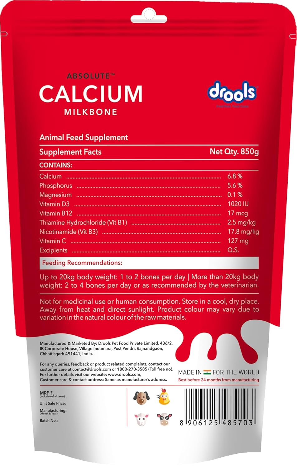 Give your pet the power of calcium with Drools Absolute Calcium Bone. Calcium is very important to us as well as for our pets. Absolute calcium bone supplement has the right ingredients to keep a dog’s bones healthy and functioning at their optimum. It contains calcium and phosphorus in the right ratio, along with all the essential vitamins to increase connective tissue and tendon strength. Daily usage promotes your four-legged friend’s health.