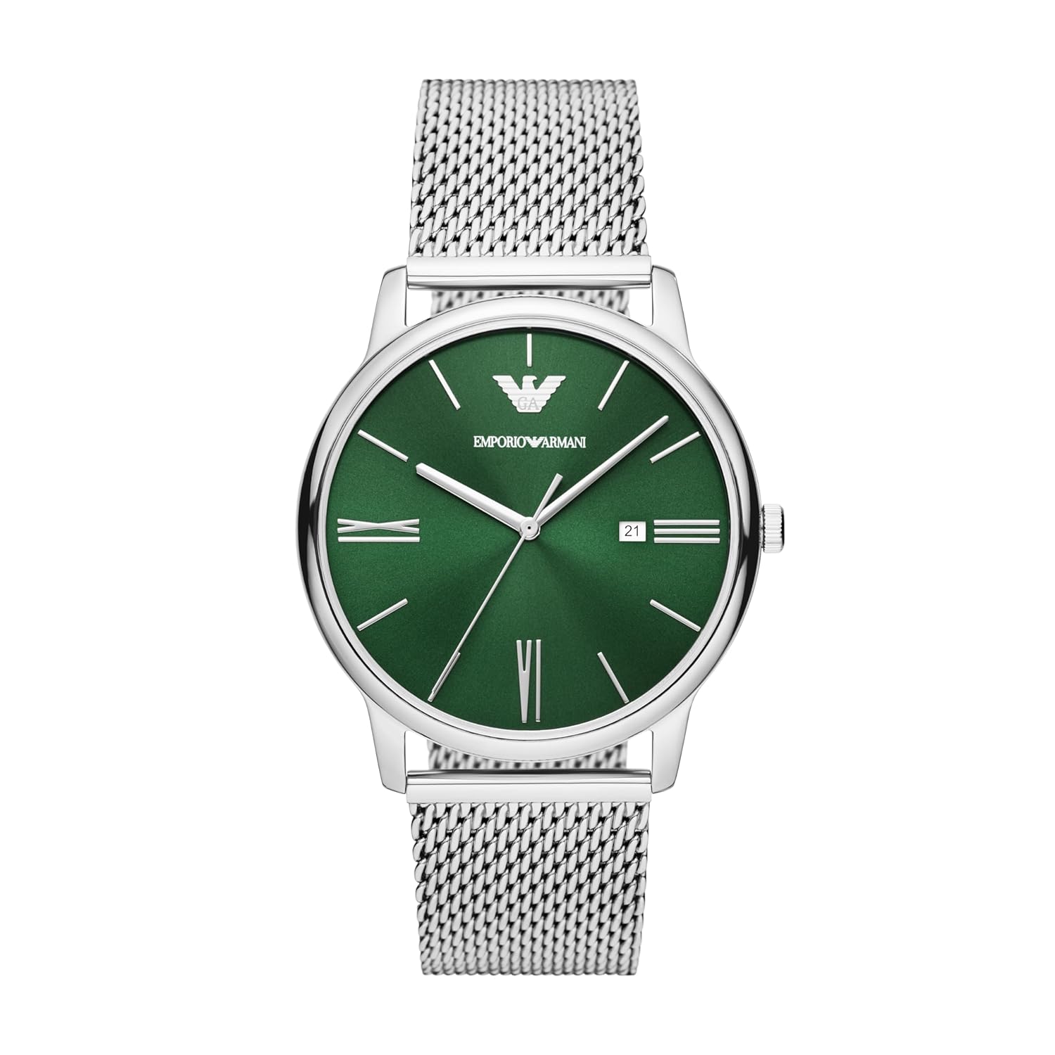 Emporio Armani’s 42mm watch features a green sunray dial, three-hand date movement and stainless steel mesh strap.