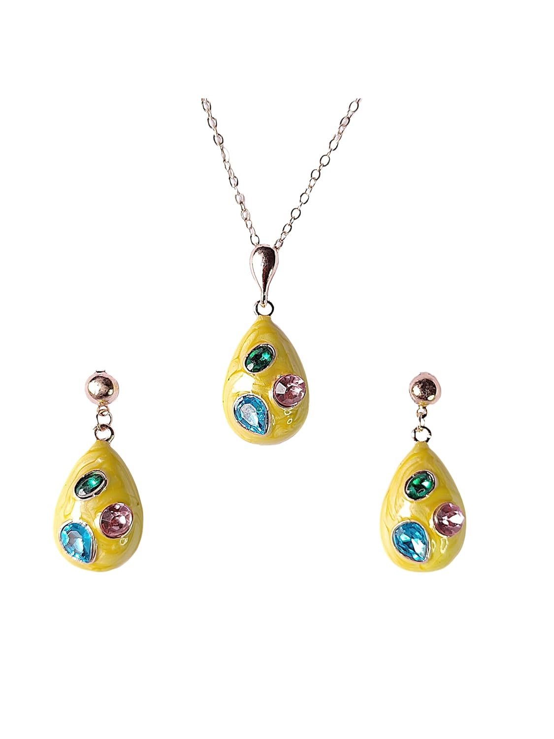 Make a striking statement with this elegant colored enamel jewellery set featuring a teardrop pendant and matching earrings. Each piece showcases a stunning arrangement of multi-coloured acrylic beads – a mesmerising emerald green, soft pink, and brilliant blue – set against a lustrous yellow enamel backdrop. The pendant and earrings are suspended from a delicate rose gold-toned chain that adds a touch of sophistication to the ensemble. Perfect for both everyday wear and special occasions, this set combines contemporary design with classic appeal. The teardrop shape creates an eye-catching silhouette, while the carefully chosen colour combination ensures versatility in matching with various outfits. The necklace features a secure clasp, and the earrings are designed for comfortable, all-day wear. This charming set arrives ready to wear or gift, making it an ideal choice for adding a pop of colour to your jewellery collection.