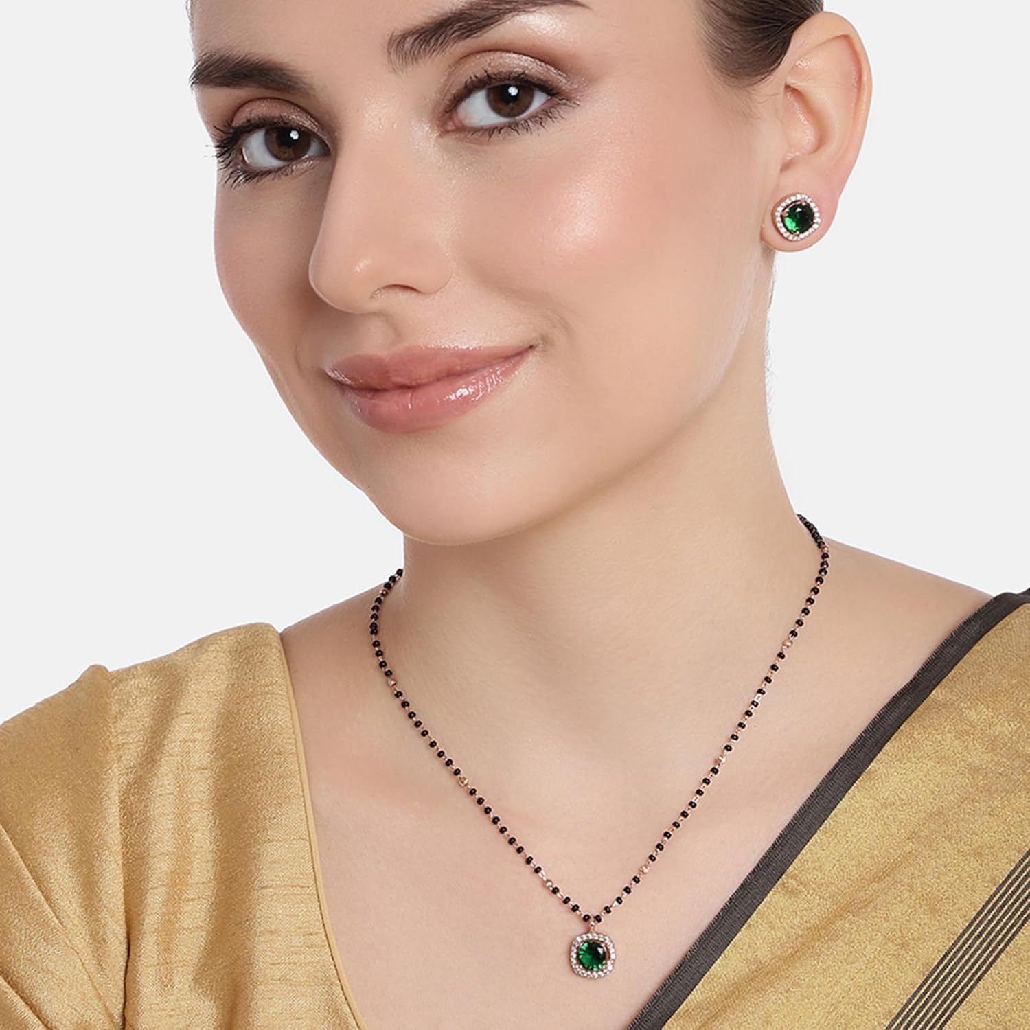 Estele Rose Gold Plated CZ Sparkling Square Designer Mangalsutra Necklace Set with Green Stones for Women