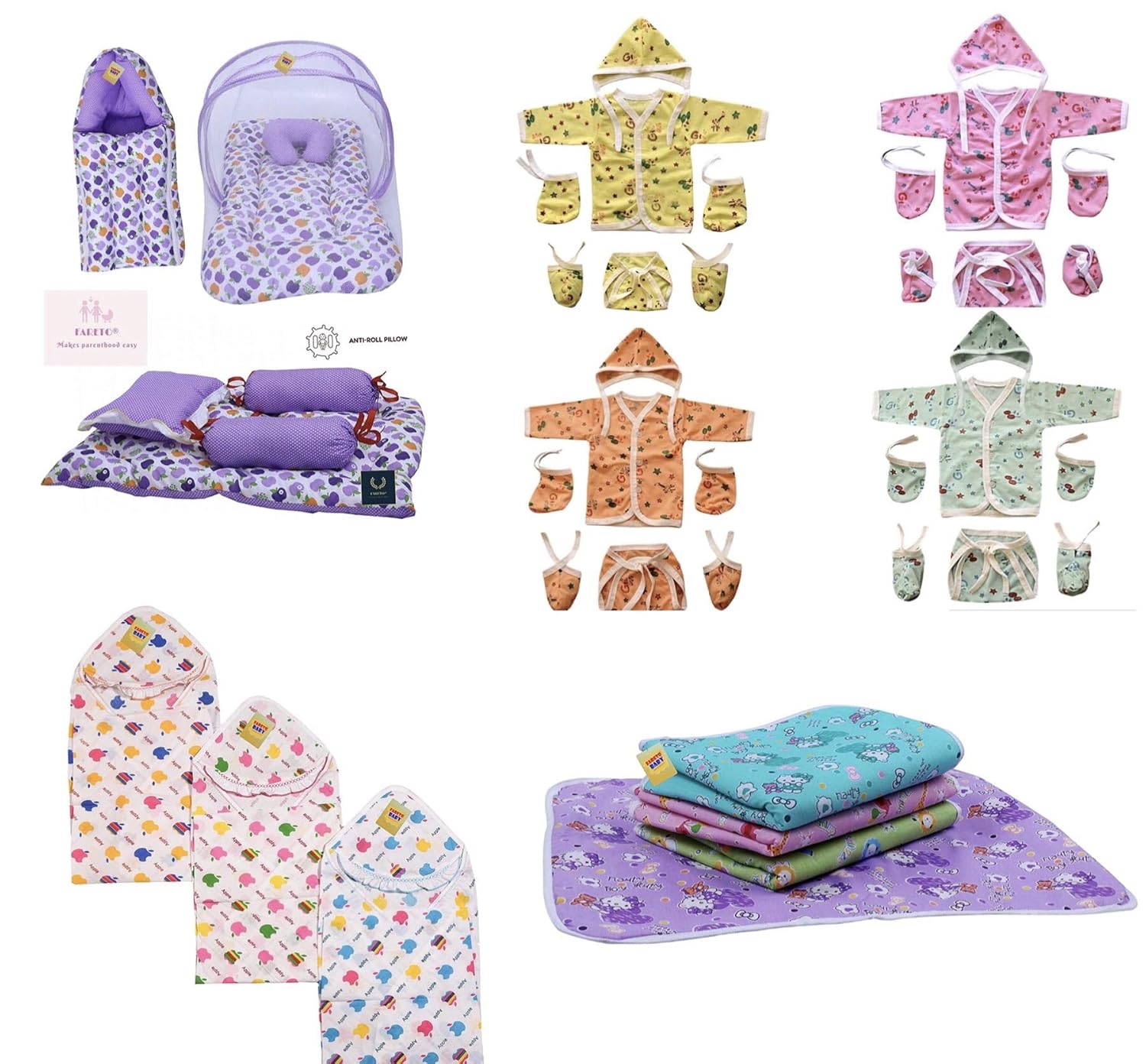 Pack Contains: 4 Front Open Shirt | 4 Nappies | 4 Caps | 4 Pairs Of Mittens | 4 Pairs Of Socks | 1 Mattress With Net | 1 Carry Bag | 4 Pcs Bedding Set | 4 Waterproof Sheets | 3 Single Layer Wraper(Total Items: 34)