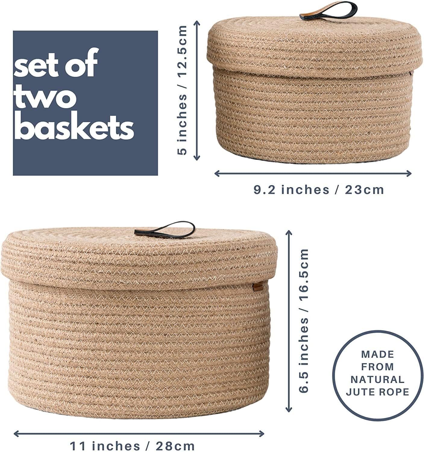 Effortlessly chic storage that’s perfect for any room in your home – introducing the Festive Textile boho round mini rope baskets! Handwoven from natural jute for a rustic, textural look Versatile round shape with convenient carrying handles Use them to neatly organize toys, linens, produce, and more Set of 2 baskets in different sizes to suit all your needs These beautiful, multipurpose baskets are a must-have for busy households. Tame the chaos in your kids’ playroom, keep towels and toiletries tidy in the bathroom, or use them to prettily display fresh fruit in the kitchen. Their neutral, boho-inspired design means they’ll blend seamlessly into any decor style. Elevate your space while getting organized – the Festive Textile storage baskets do it all!
