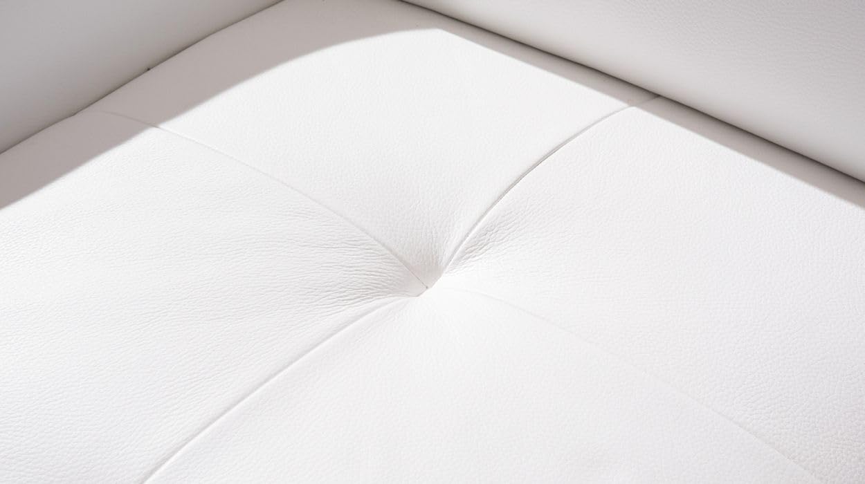 B] Outter material – 1)leatherette – it is artifical leather made out of pvc and its known as faux leather it would never peel out or form any kind of cracks 2) legs – the legs are made of ss steel 3]capacity of sofa 7 seater 4] the sofa is finished with natural white color. 5) It consist of one seat automatic recliner which moves back and forth.