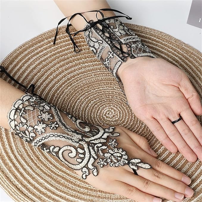 Add a touch of vintage elegance to your ensemble with these exquisite fingerless lace gloves. Available in classic black, passionate red, pure white, and sophisticated gold black, these gloves feature intricate floral and scroll patterns that create a stunning gothic or Victorian aesthetic. The delicate lace overlay extends gracefully from the wrist to the fingers, offering a perfect blend of sophistication and allure. These versatile accessories are ideal for formal occasions, weddings, costume parties, or theatrical performances. The fingerless design allows for practical use while maintaining a glamorous appearance. The detailed embroidery work showcases beautiful baroque-inspired motifs, making each pair a statement piece. These one-size-fits-most gloves are crafted with attention to detail, ensuring both comfort and style. Perfect for brides seeking a traditional yet dramatic accent, or for anyone wanting to add a romantic, vintage-inspired element to their wardrobe.
