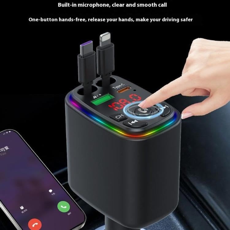 🎵 Bluetooth FM Transmitter: Stream your favorite music or make hands-free calls directly through your car’s FM system. Combines charger, FM transmitter, USB player, and LED indicator in one compact unit.
