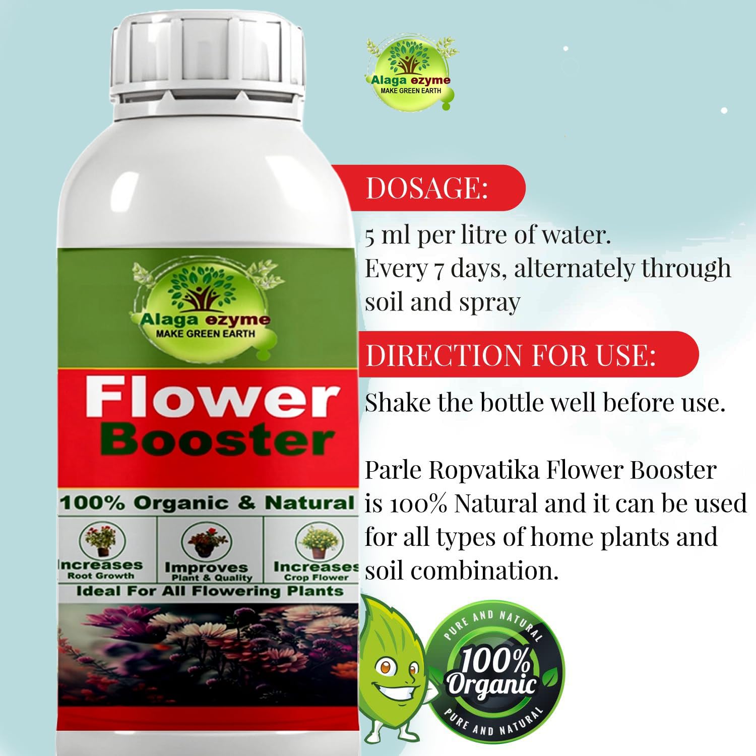Alagaezyme Flower Booster Liquid Fertilizer is Naturally Derived Organic Manure Flower Booster Flower Booster Flower Booster Increase Flower Production Contents All Essential Multi Micro Nutrients for All Flowering Plants For Healthy & Lush Green Plants Increases the plant size and number of flowers per plant Organic Input Residue Free Product – NPOP Organic Input Flower Booster Flower Booster Flower Booster Enhances plant growth Enhances plant growth and protects from pests and diseases Boost Flowering Improves flowering and maximizes fruit formation Soil Enrichment Provides essential micro, macro and trace nutrients