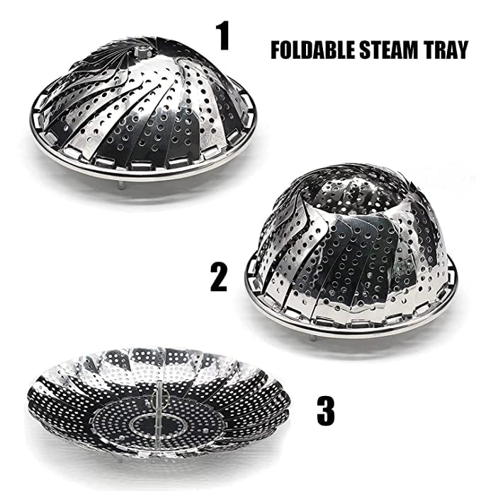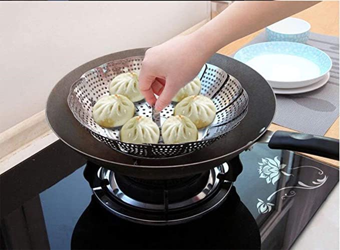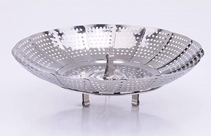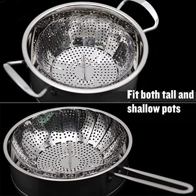 Stainless steel Steamer Basket – The size of the small steamer is suitable for sauce pans with a diameter of 5.1-9.5, sauce pan, stock pots, woks, etc. The folding steamer basket is made of food grade 18-10 stainless steel for safe contact with food and ensure your health