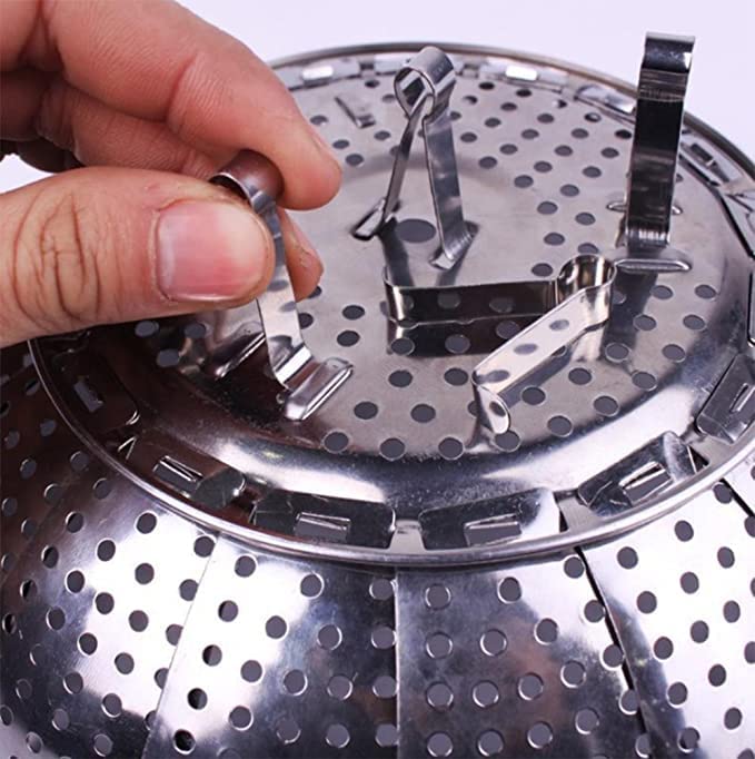 Hole in Steamer Basket – The holes on the stainless steel expandable steamer basket is good for steaming and drainage. The ingredients placed on the vegetable steamer basket for pot will not directly contact the boiling water, but the hot steam after the water boils through the steam holes on the veggie steamer basket to cooking the food. As a healthy cooking method, steaming the food can preserve the nutrients in the food
